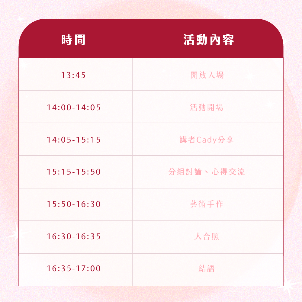 不定期舉辦不同主題的活動,請各領域的講師分享照顧自己和自我提升精進的方法,