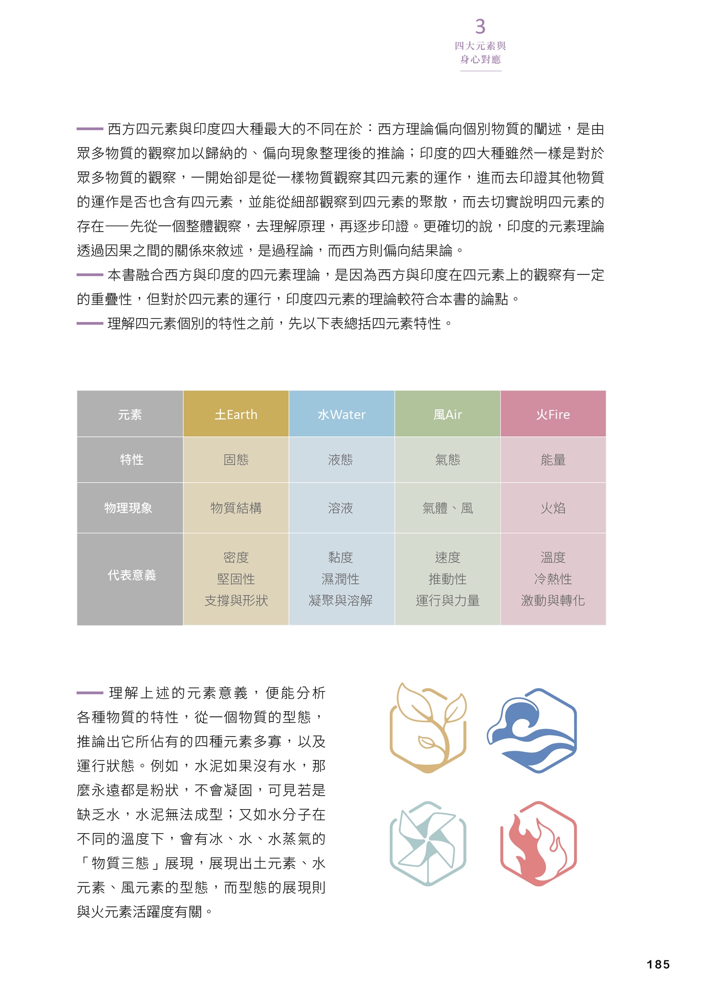 |Part3|獨立探討「四大元素」。以精油四象限對應四大元素,分析元素與分子大類的性狀,並結合四大元素性質說明身心對應關係,接著分析人體系統,讓身體系統的元素運作更好理解;本章逐步進入芳香分子的協同作用,對於四元素、芳香分子,以及身心對應的各種呼應,先概觀認知。