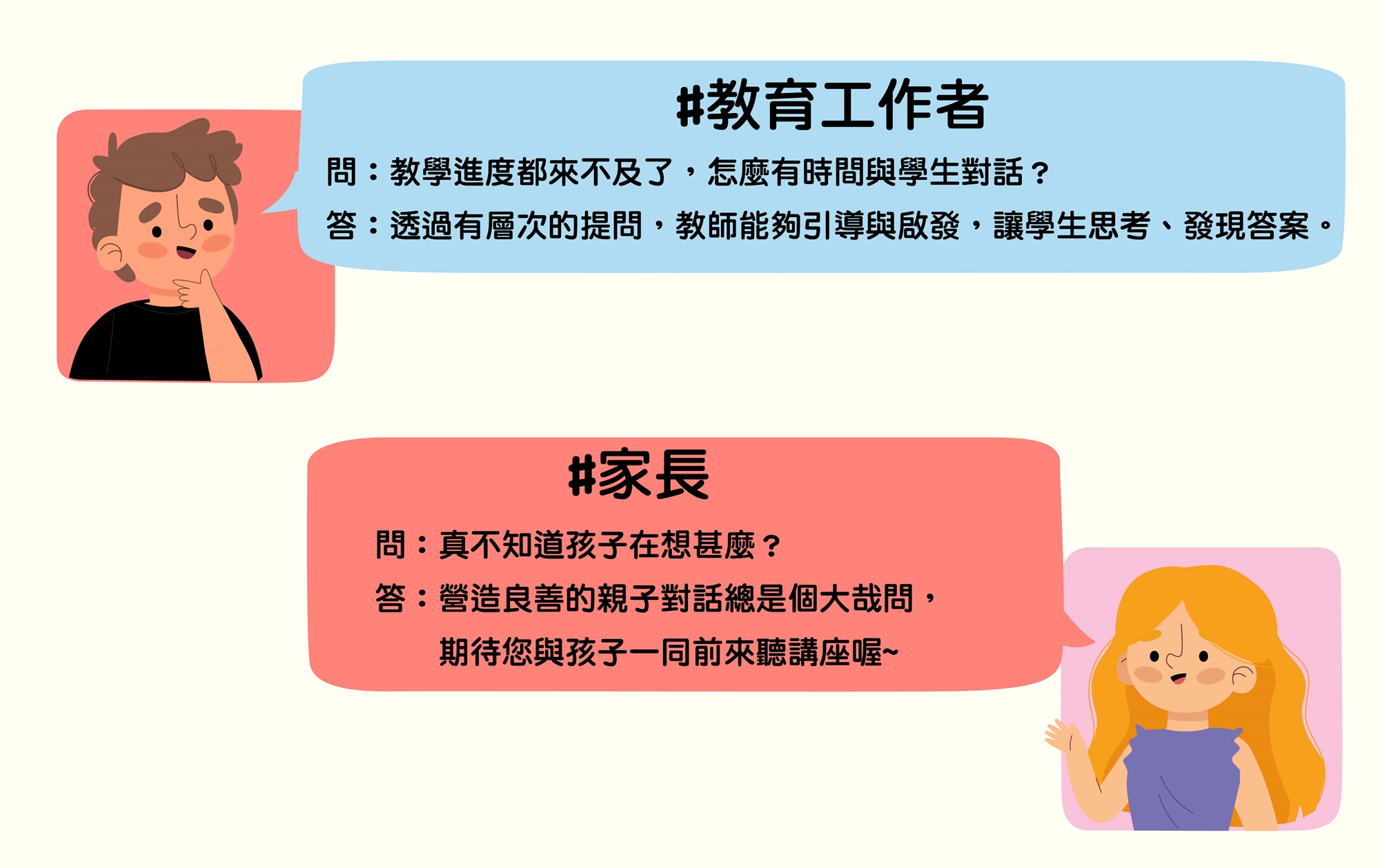 「怎麼說,孩子願意聽;怎麼問,孩子願意說!」點出了師生對話、親子對話的關鍵所在。要培養出能「自主學習」的孩子,就要先啟動孩子思考的引擎,無疑的,「提問」要比「給答案」重要得多,而且提問要有層次,孩子的學習才會有深度。