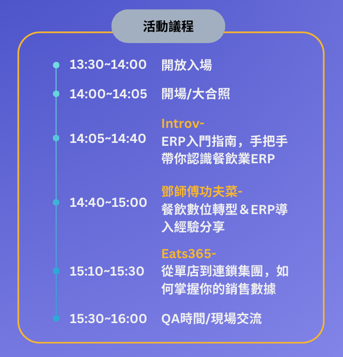 不管你是餐飲業新手、正在擴展規模想了解ERP系統的餐飲業者、或是已經在經營集團、食品工廠的老闆都很適合報名本場講座!