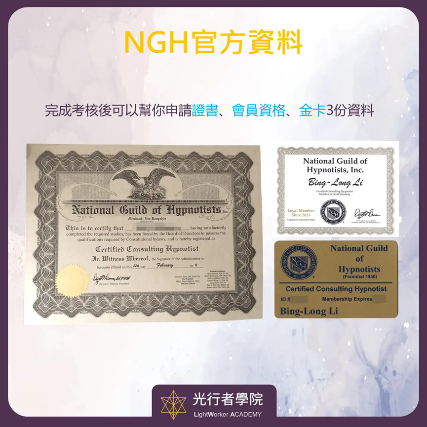 若要申請美國國家催眠師公會的催眠諮詢師證照(NGH Certified Consulting Hypnotist),請在課程最後一天前繳交作業再提出申請,需另外加證照費用USD 150(大約新台幣5000)