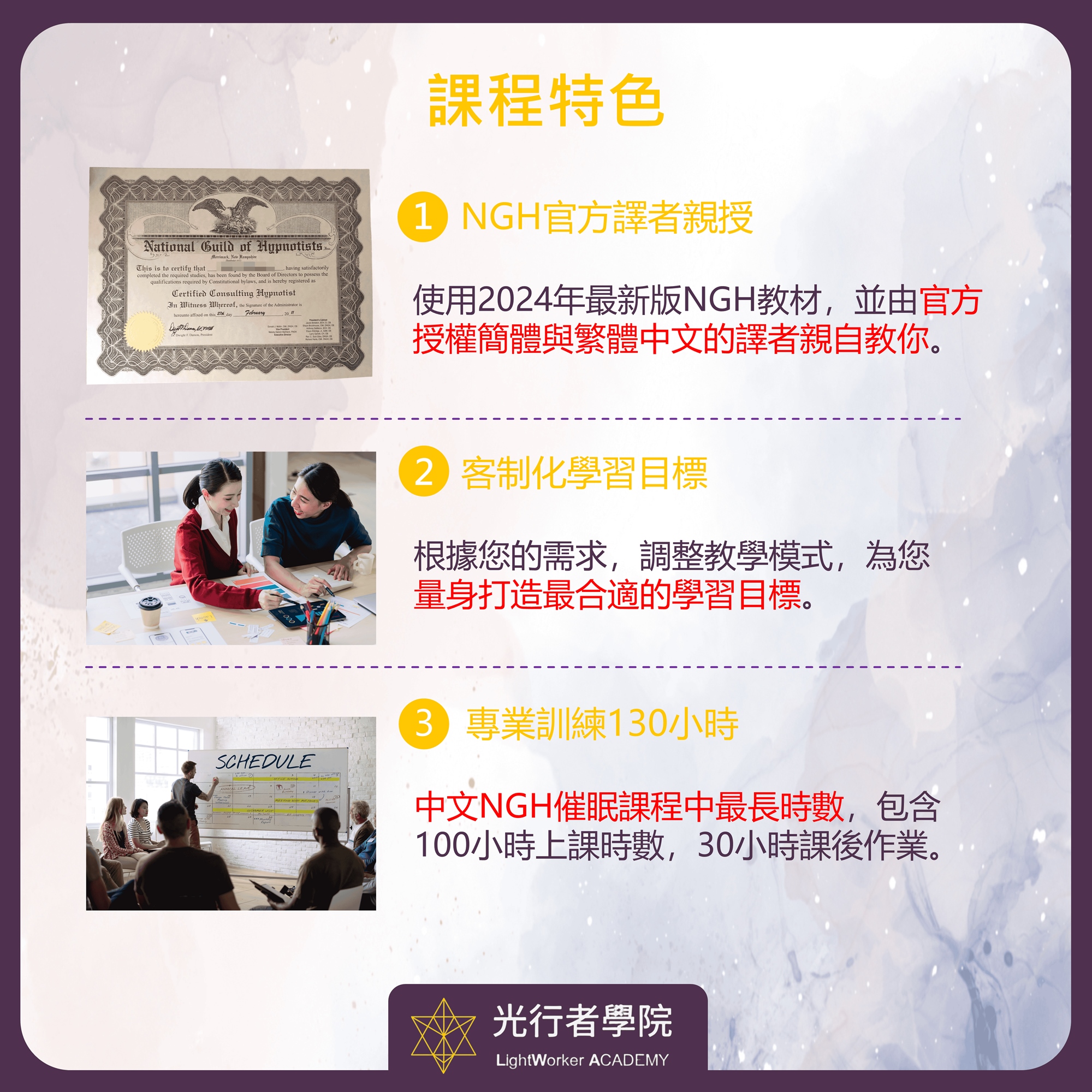 《光行者中心》的課程不同於坊間NGH催眠課程。我們深知每個人都有獨特的學習模式,所以我們的專業團隊將根據您的需求,針對性調整教學模式,為您量身打造最合適的學習目標。無論您是希望掌握催眠的基礎知識,還是希望進一步提升催眠技巧,甚至是成為催眠師,我們都能滿足您的需求,以確保每位學生都能得到最適合自己的學習體驗。
