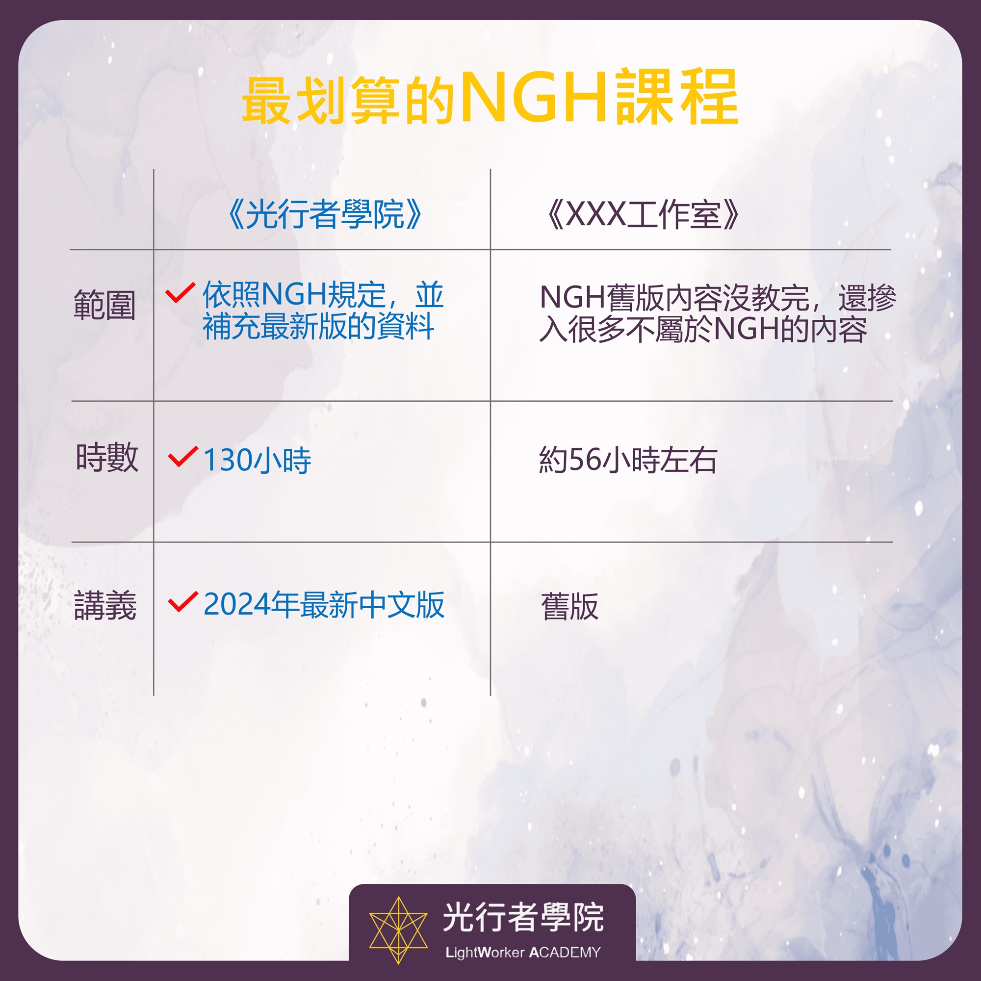 從1991年開始美國NGH官方規定最低100小時訓練時數,包含至少75小時上課時數(Class Hours)和25小時自學時間(Independent Study)。而《光行者中心》真心為了培訓出有實力的催眠師,所以提供130小時完整專業訓練,是目前華文NGH催眠課程中最多時數的,包含100小時上課時數,30小時課後作業。其實大家仔細看下面的課程大綱就會發現NGH最新版上課教材的內容很多,所以我不認為上課時數低於85小時能把這門課有品質的教完,用100小時來教也不為過。