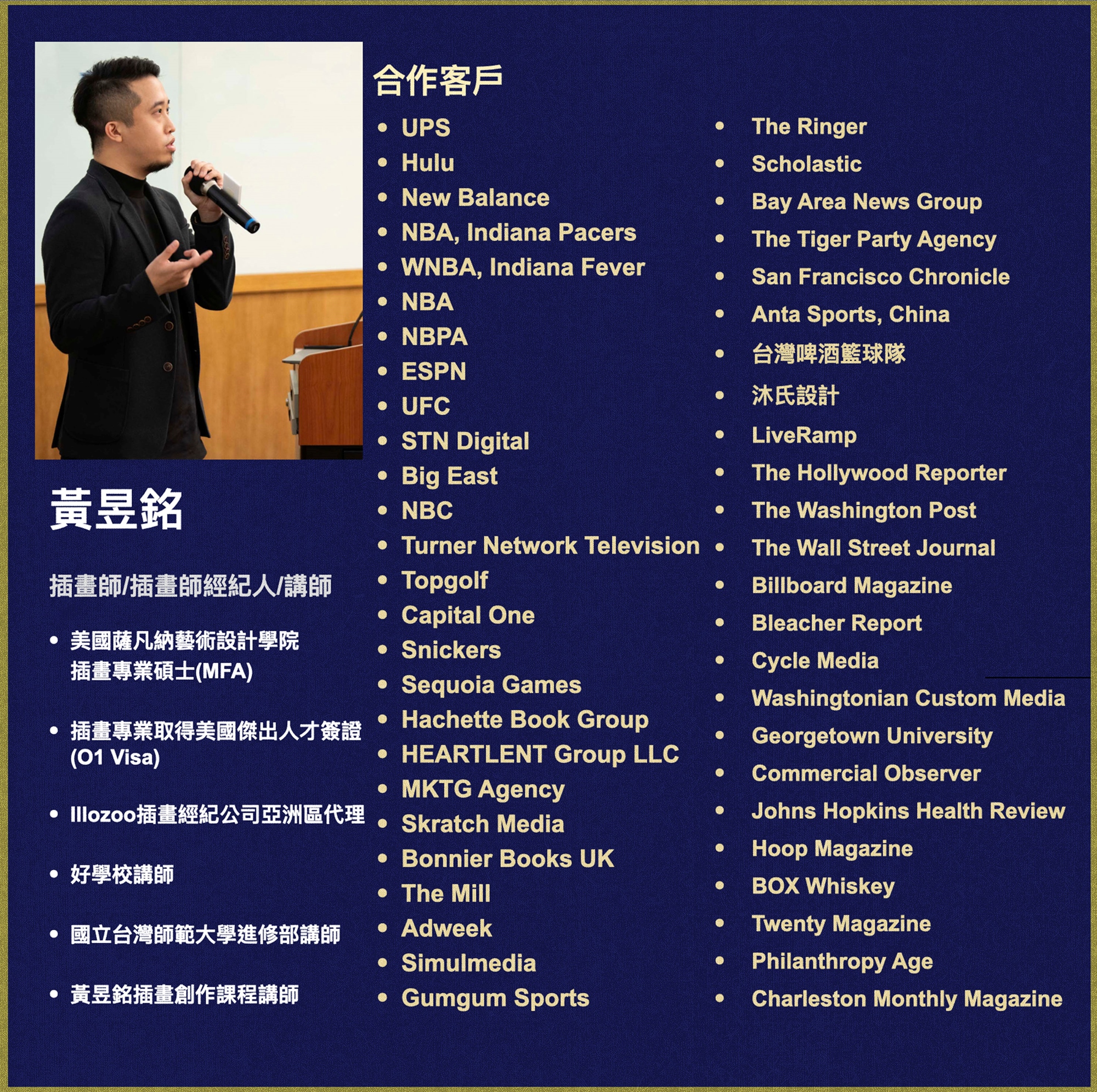 除了以經紀人的身份與美國蘋果、藍人樂團和亞馬遜影音有合作經驗外,黃昱銘個人經營的插畫風格也是活躍於歐美市場,獲得如UPS、NBA、士力架、華盛頓郵報、華爾街日報等知名品牌和出版社親睞,參與多個領域專案,包括體育、遊戲、廣告、出版等,有著相當豐富的國際合作履歷。