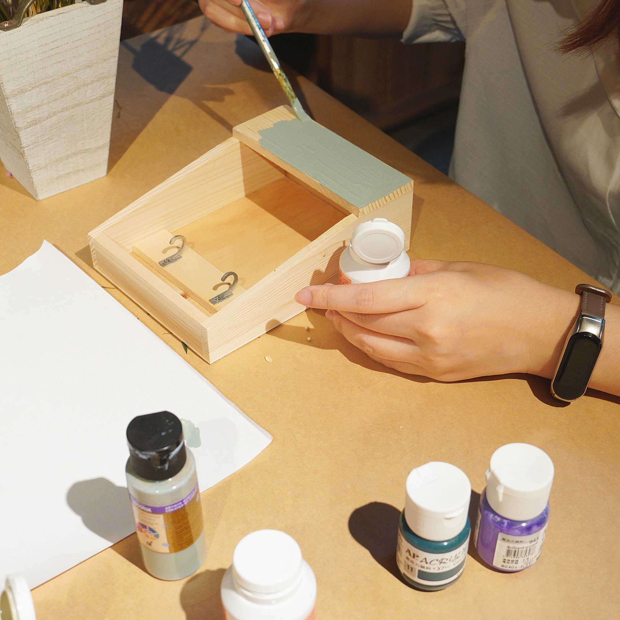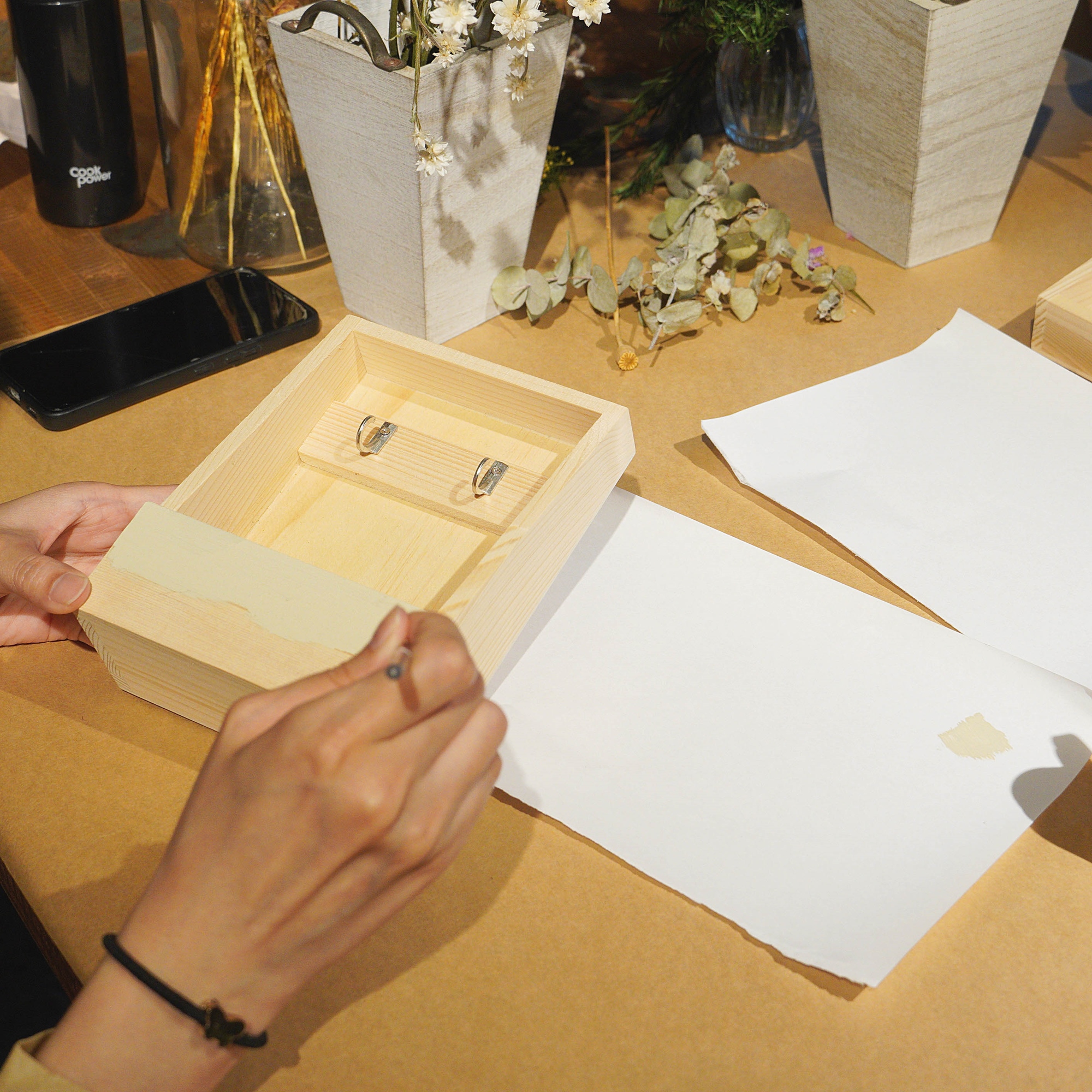 從木盒上色開始自行設計選色、挑選花材和花材配置,可以感受到每人不同特質與喜好,打造出專屬自己的花禮盒。