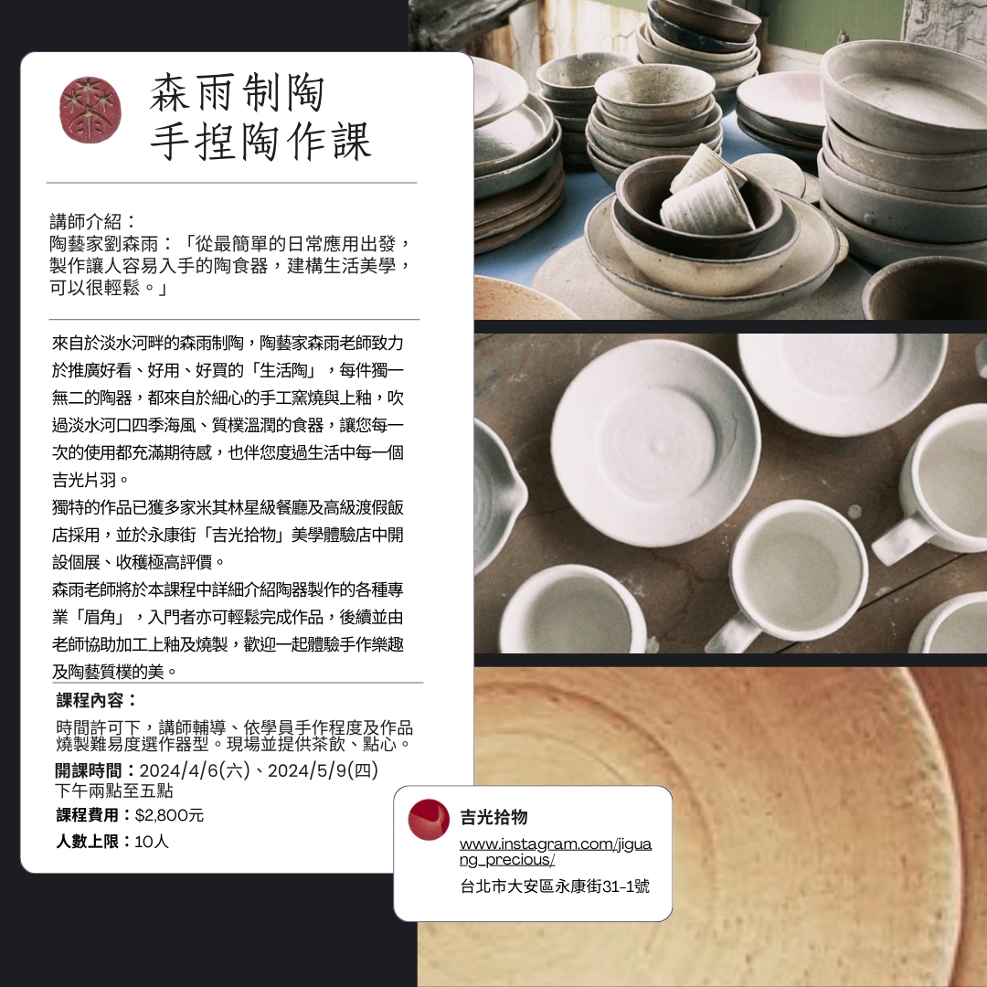 森雨老師將於本課程中詳細介紹陶器製作的各種專業「眉角」,入門者亦可輕鬆完成作品,後續並由老師協助加工上釉及燒製,歡迎一起體驗手作樂趣及陶藝質樸的美。