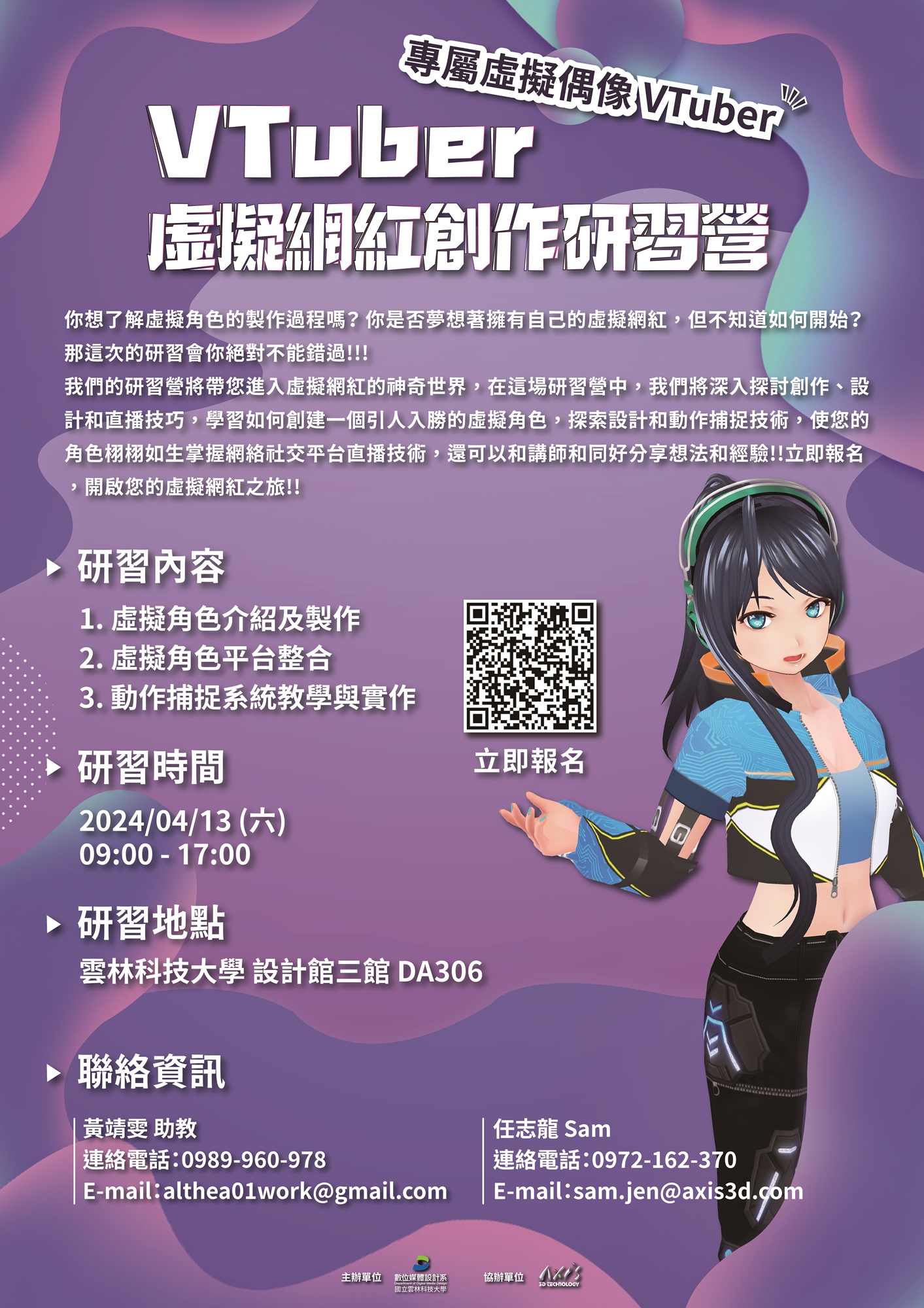 比賽官網頁面:https://www.axis3d.com/post/2024元宇宙虛擬網紅創作設計大賽報名開跑囉