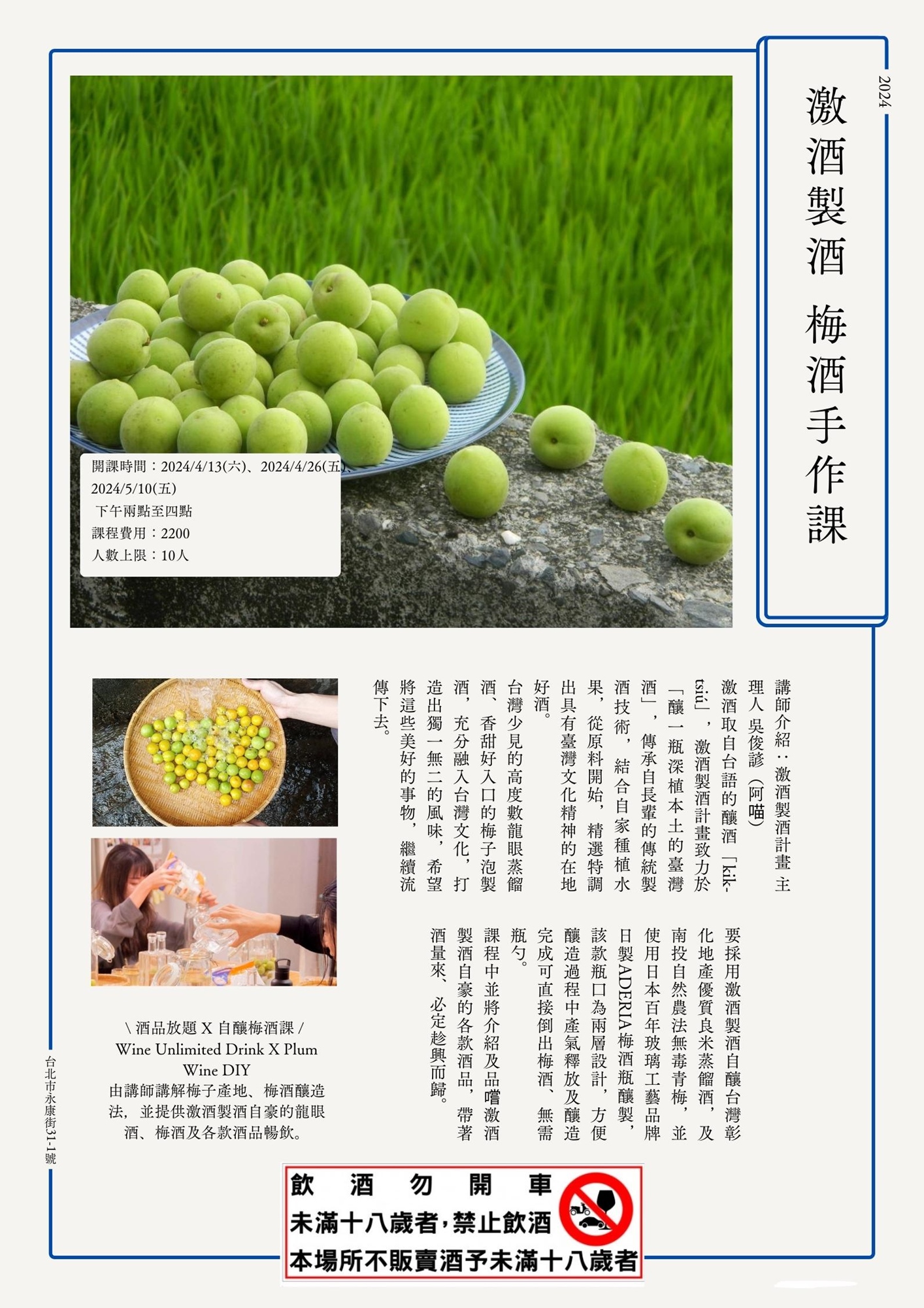 由講師講解梅子產地、梅酒釀造法,並提供激酒製酒自豪的龍眼酒、梅酒及各款酒品暢飲。