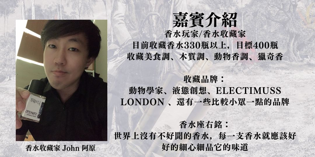 本月VIP加場的香談室,除了要讓香寶們品香以動物為主題的潘海利根獸首系列香水外,特別邀請到香水收藏玩家John阿原來分享他收藏的動物學家「Zoologist」系列香水。有機會聞到大象、暴龍、蹄兔、或是變色龍的味道,就看各位香寶們參與熱烈程度摟~~