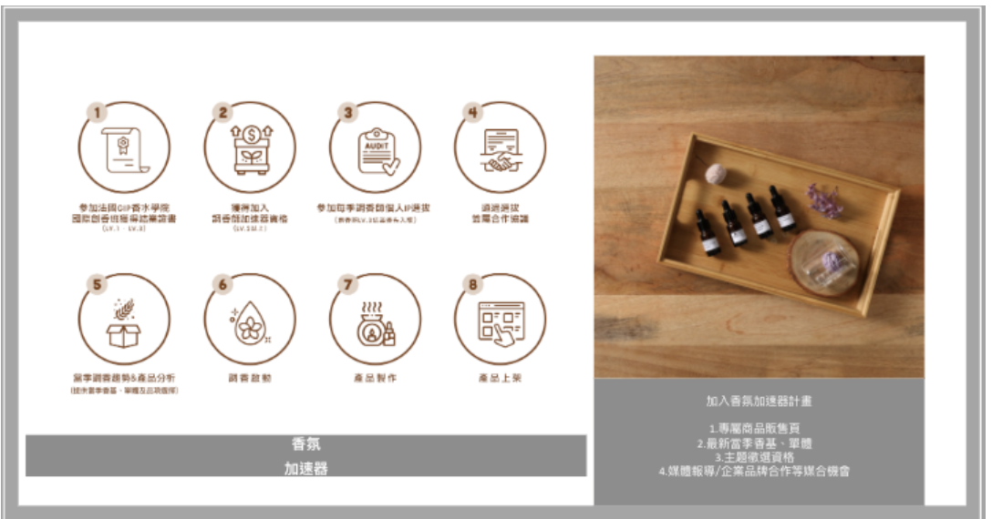 「調香師加速計畫」是香氛加速器的重要計畫,每季公開一個招募主題,並開放調香師報名,從中選出3~5位調香師,提供20款單體及香基,其中包含當季最新季節品,再搭配常用香基與單體。