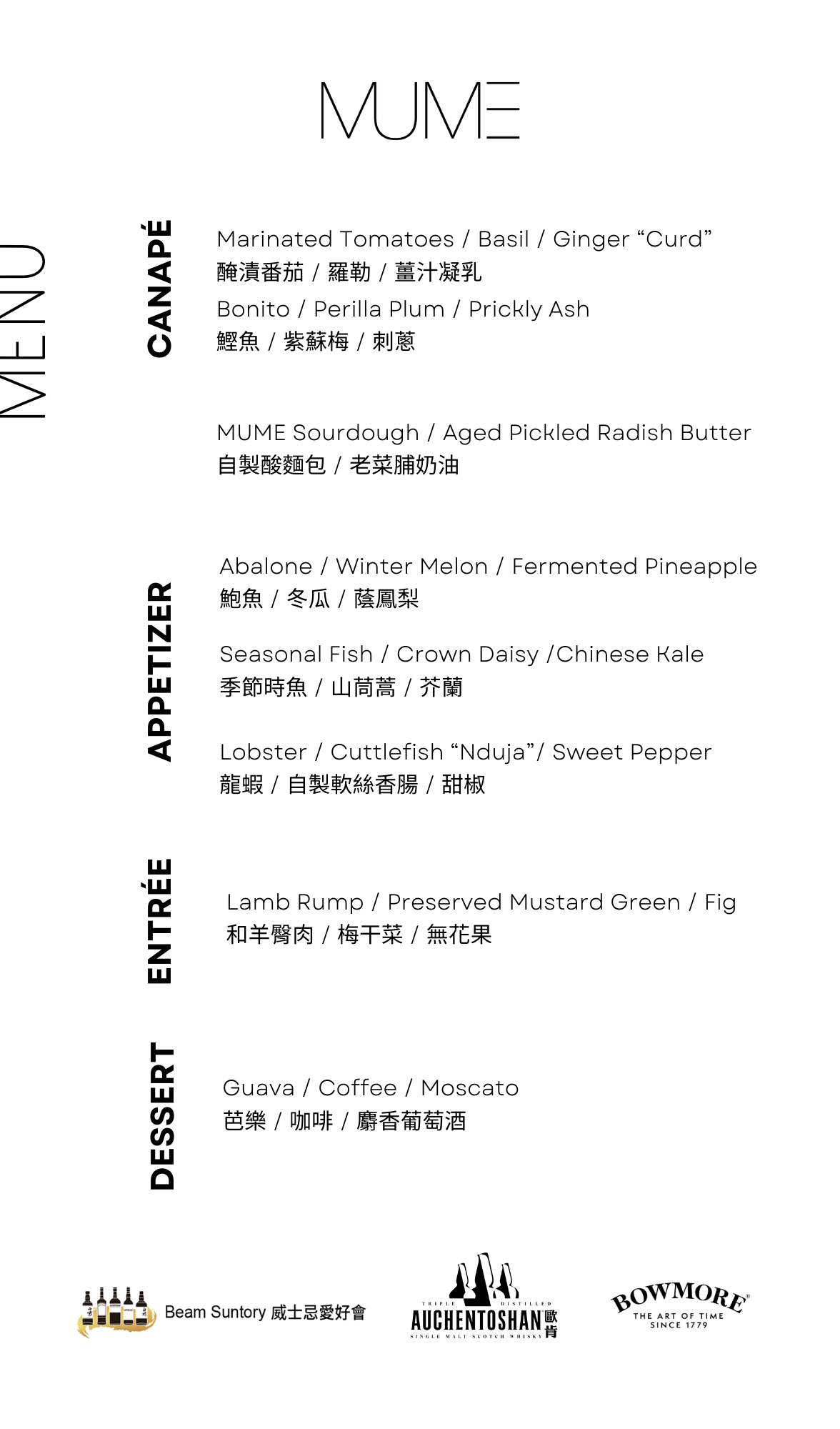 MUME餐廳,以台灣的國花「梅花」拉丁文命名,代表著對這塊土地深厚的愛及其文化的傳承。MUME利用現代歐洲的烹調手法,展現台灣獨有的原生食材,創造出讓人讚嘆的料理。此外,MUME餐廳主廚林泉(Richie Lin)特別為本次餐酒會設計了一道獨特的菜品,這道菜只在本次活動中供應,意在展現歐肯威士忌與MUME料理之間的完美匹配,透過這場活動讓參與者體驗到一次無法複製的味蕾之旅。