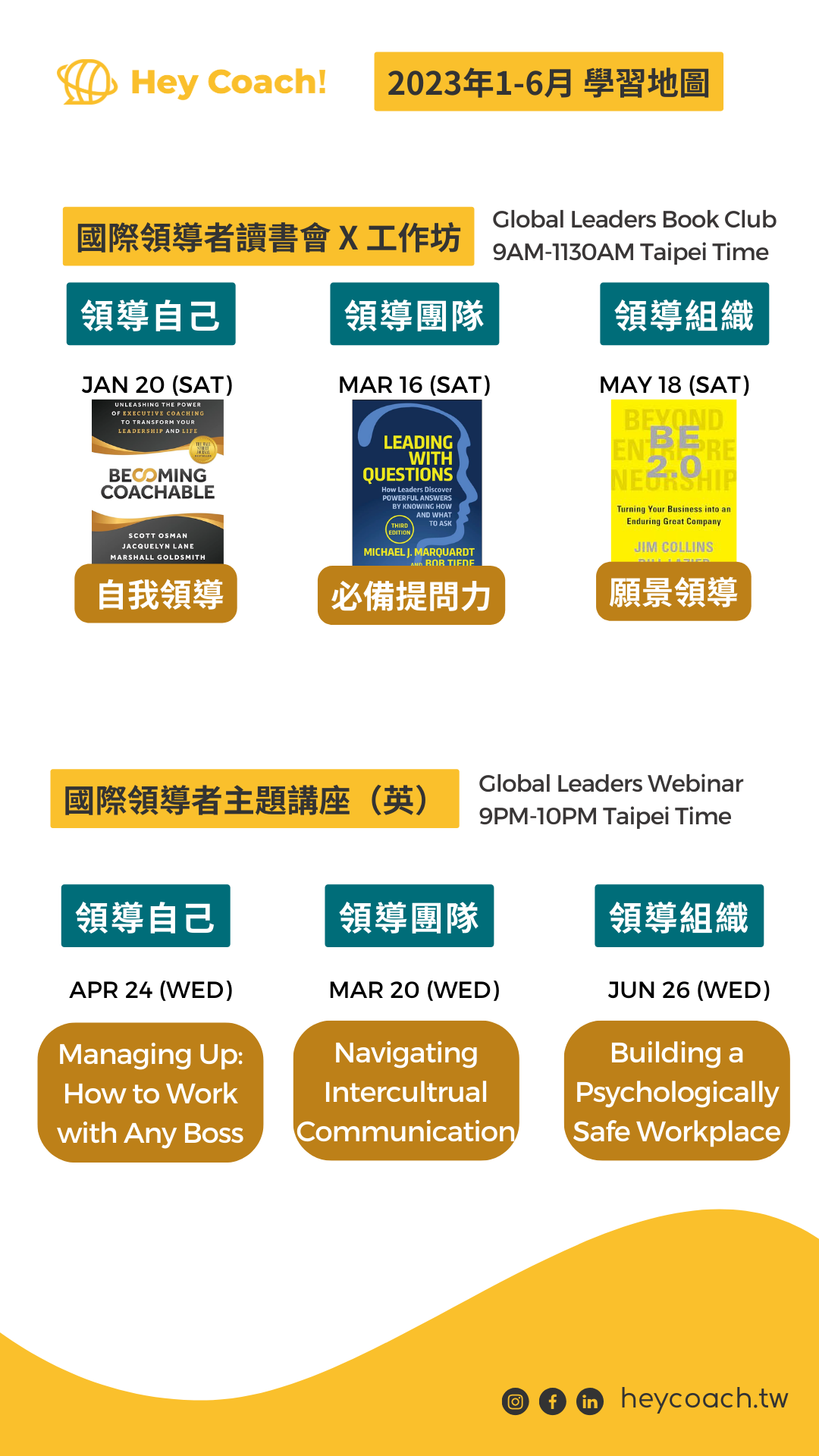 我們從「領導自己」、「領導團隊」與「領導組織」三個面向來選書,時間是台灣時間奇數月第三個週六早上9:00-11:30。另外也有英文版的【國際領導者主題講座】,在週間晚上進行。