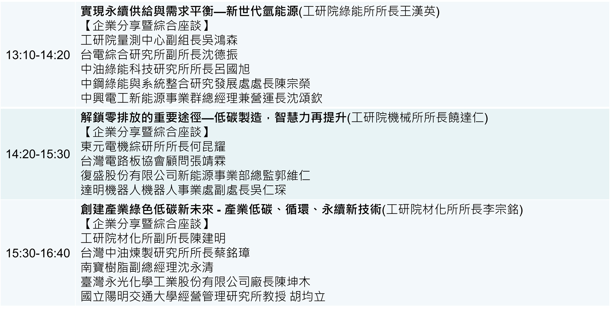 第三屆「 ITRI NET ZERO DAY打造淨零時代競爭力」論壇暨特展,以淨零平台者的角度,匯集金融、投資顧問、半導體、電信、能源、石化鋼鐵、材料設備等20多位跨領域專家及企業領袖與政策領導者,探討企業所需淨零解方與綠色金融、提供淨零轉型策略顧問、討論新世代能源-氫能最新發展、提升智慧力的低碳製造、發展資源循環再生零廢棄等主題;現場也展示逾30項創新淨零技術,包括: