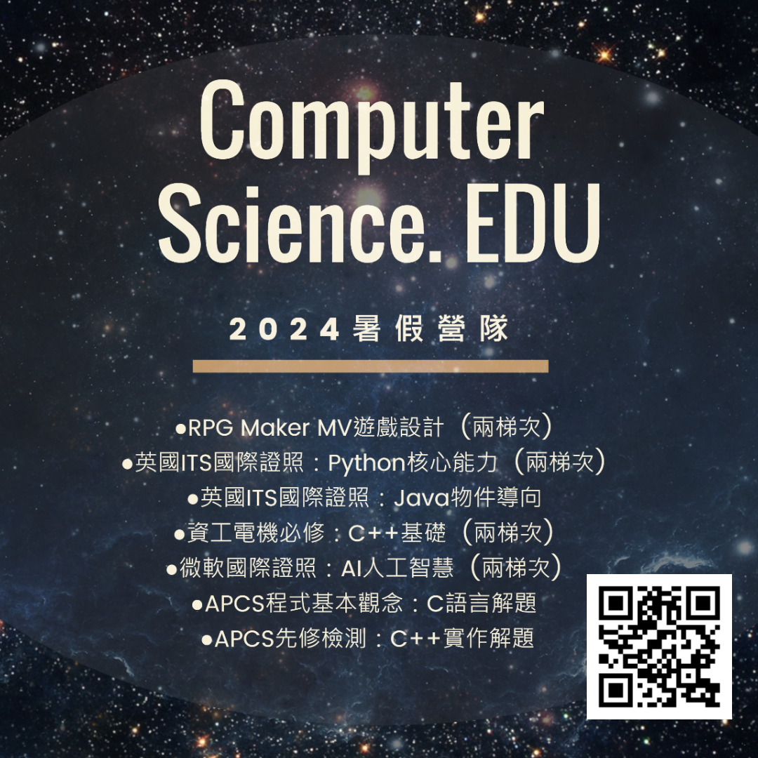 - 課程內容:APCS「第二大題實作題」範圍,建議有C++基礎學生參加,上課搭配歷屆試題解題。