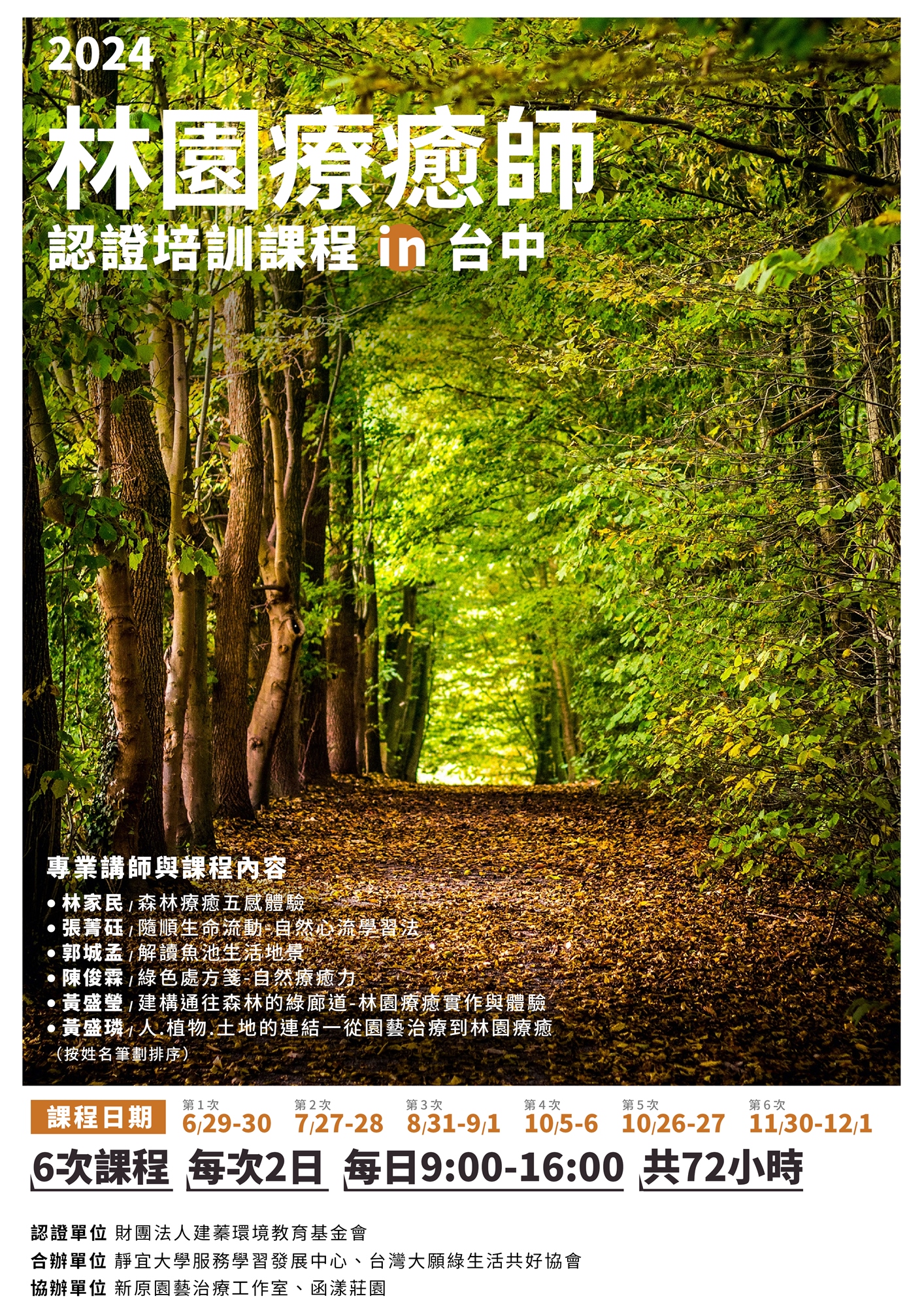完成第一階段72小時課程並通過二次的活動帶領見習以及三次經督導評量及格之實習,得授證成為「林園療癒師」。