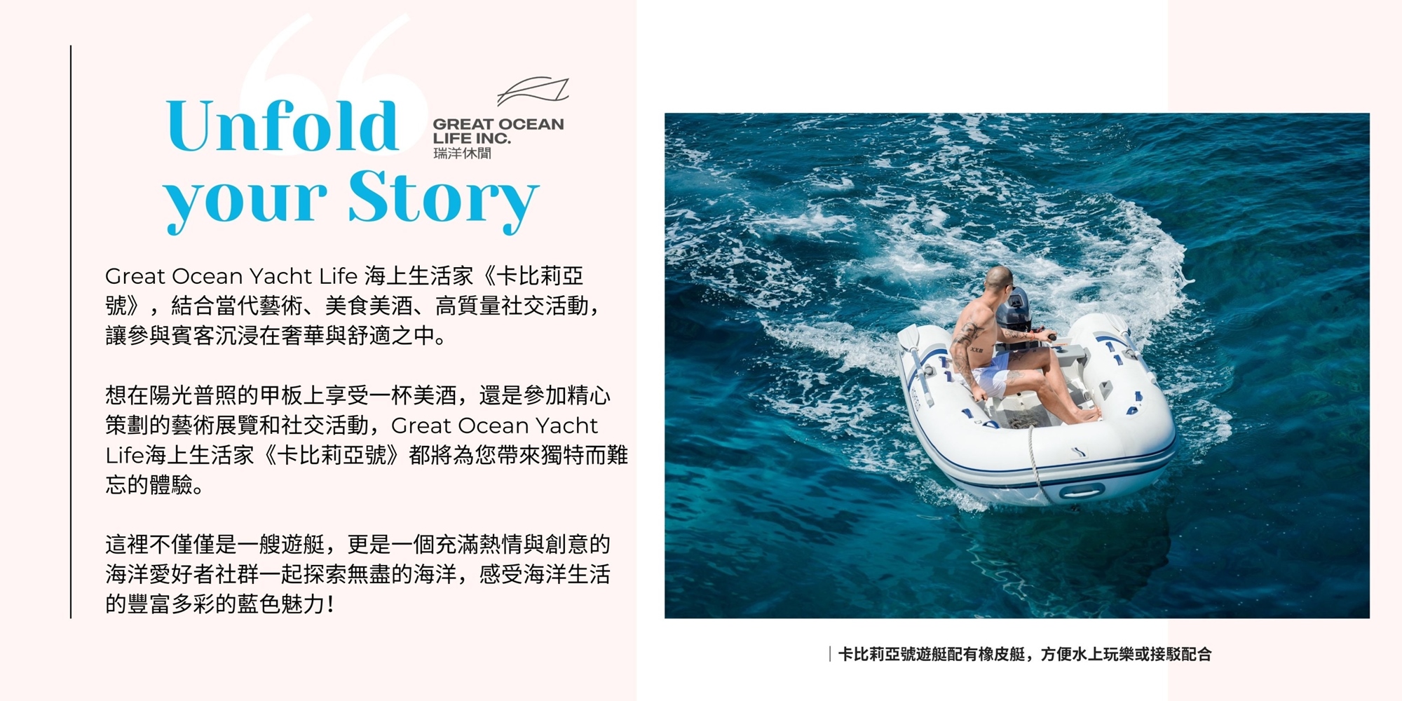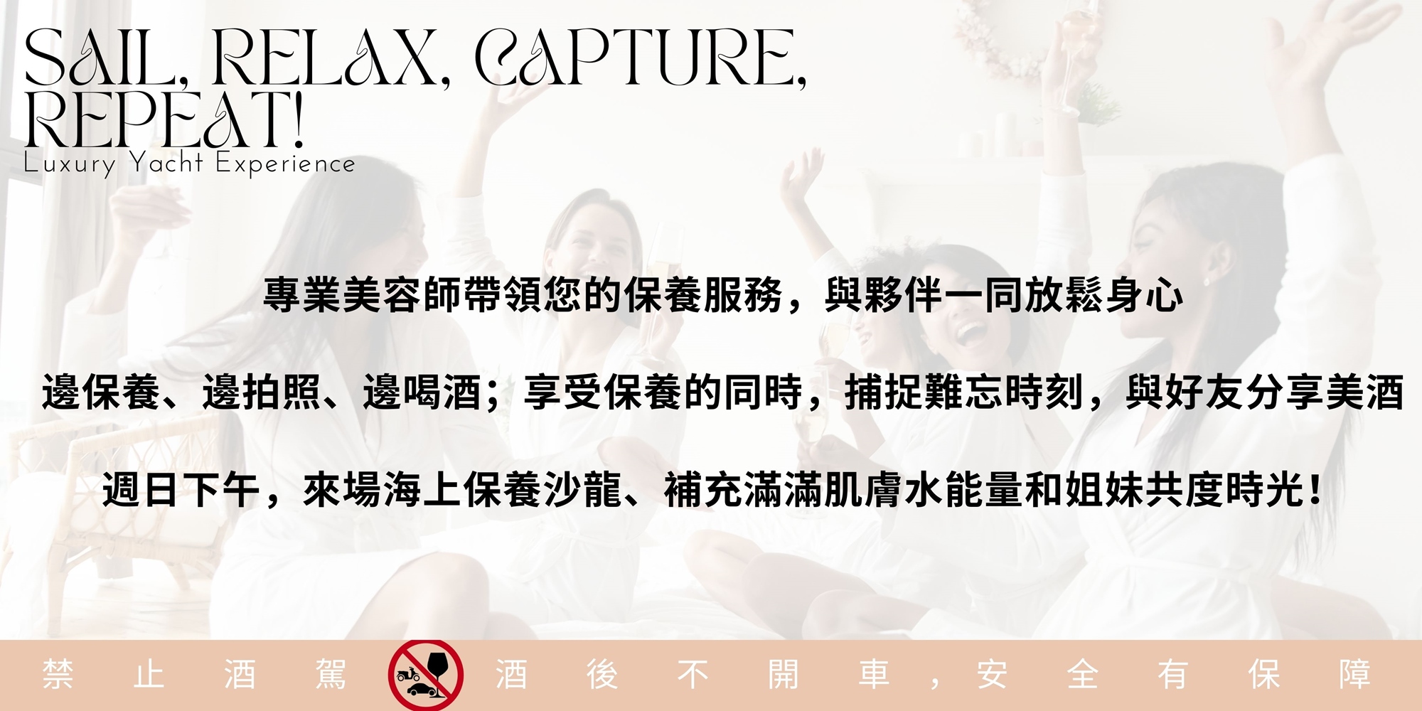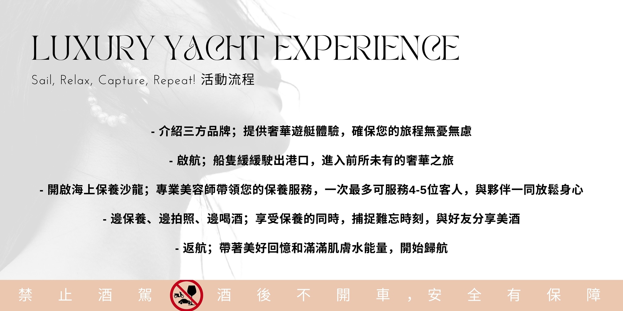 在藍天碧海的映襯下,我們誠摯地邀請您參加我們舉辦的海上護膚遊艇保養派對。請您穿上您的極致舒適服飾,盡情沉浸在這場尊榮的護膚派對中,別忘了攜帶您珍愛的護膚產品、由美容師跟您分享如何在家達到沙龍級效果 !