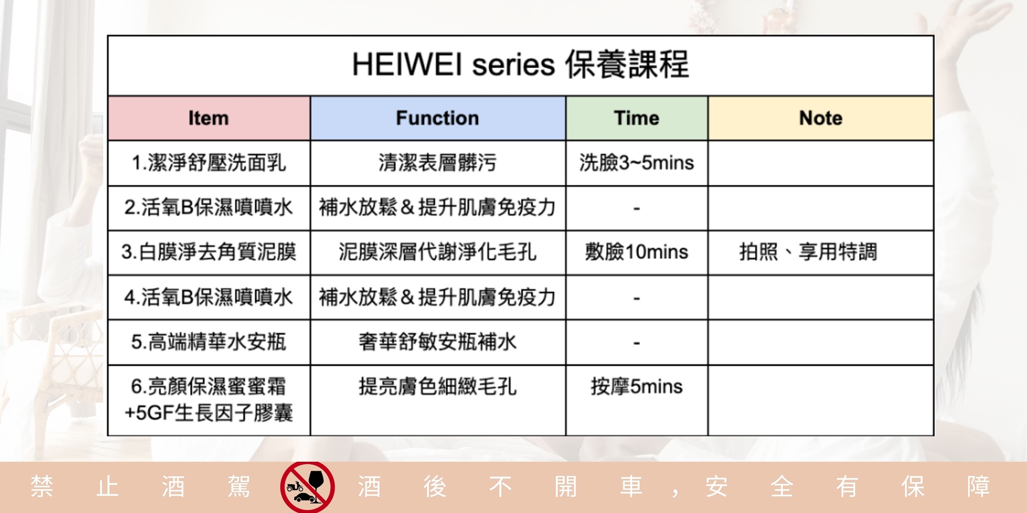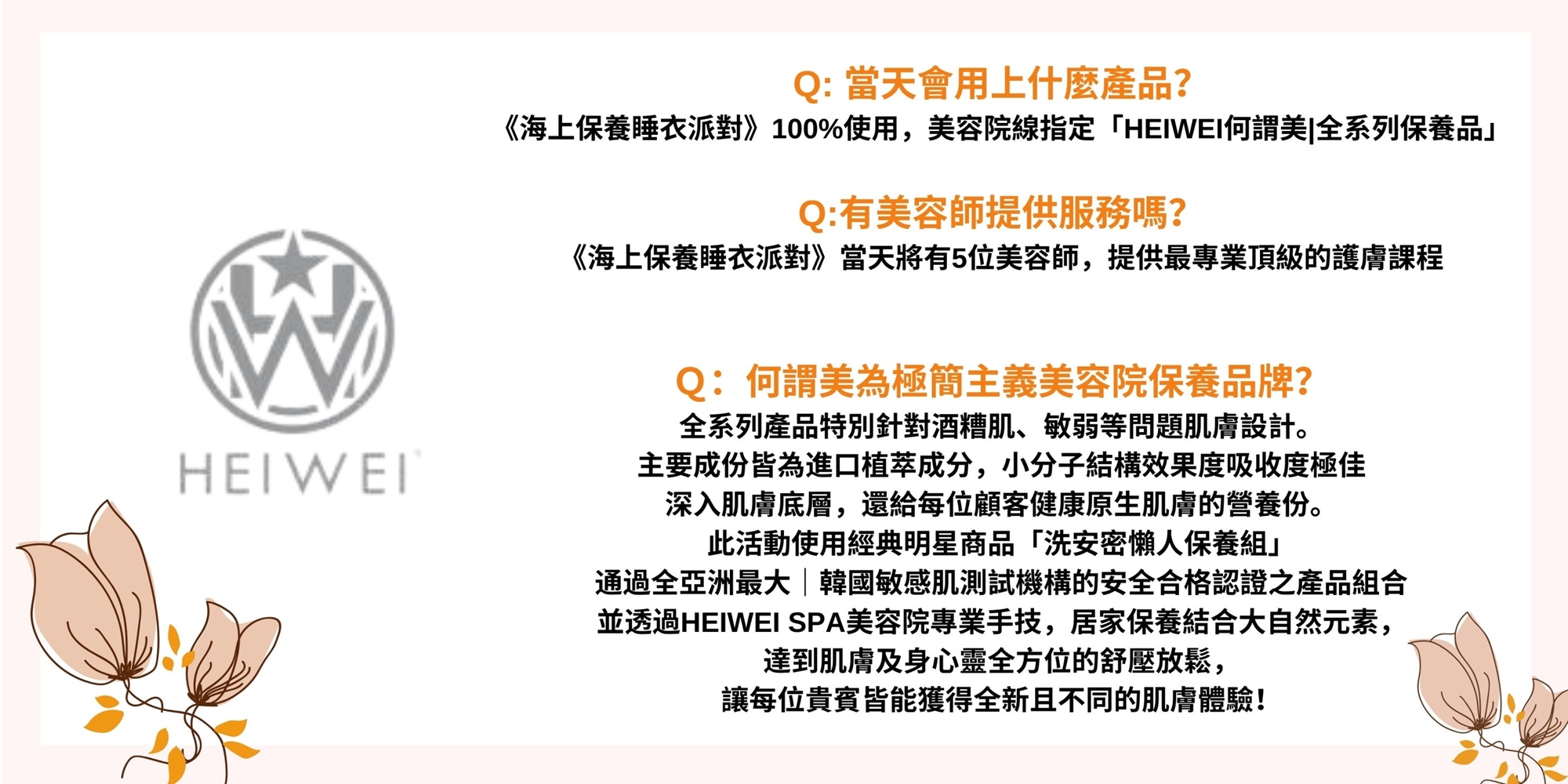 《海上保養睡衣派對》100%使用,美容院線指定「HEIWEI何謂美|全系列保養品」。