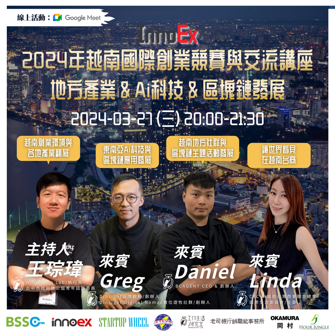 本次講座將邀請Ai科技與區塊鏈研究越南創業生態系的專家,為台灣新創團隊介紹越南創業生態系概況、InnoEx越南國際創業競賽的賽事內容與獎項、地方產業發展趨勢、AI科技應用、區塊鏈技術發展等趨勢。講座也將安排越南新創團隊分享,讓台灣新創團隊能夠更深入了解越南市場。