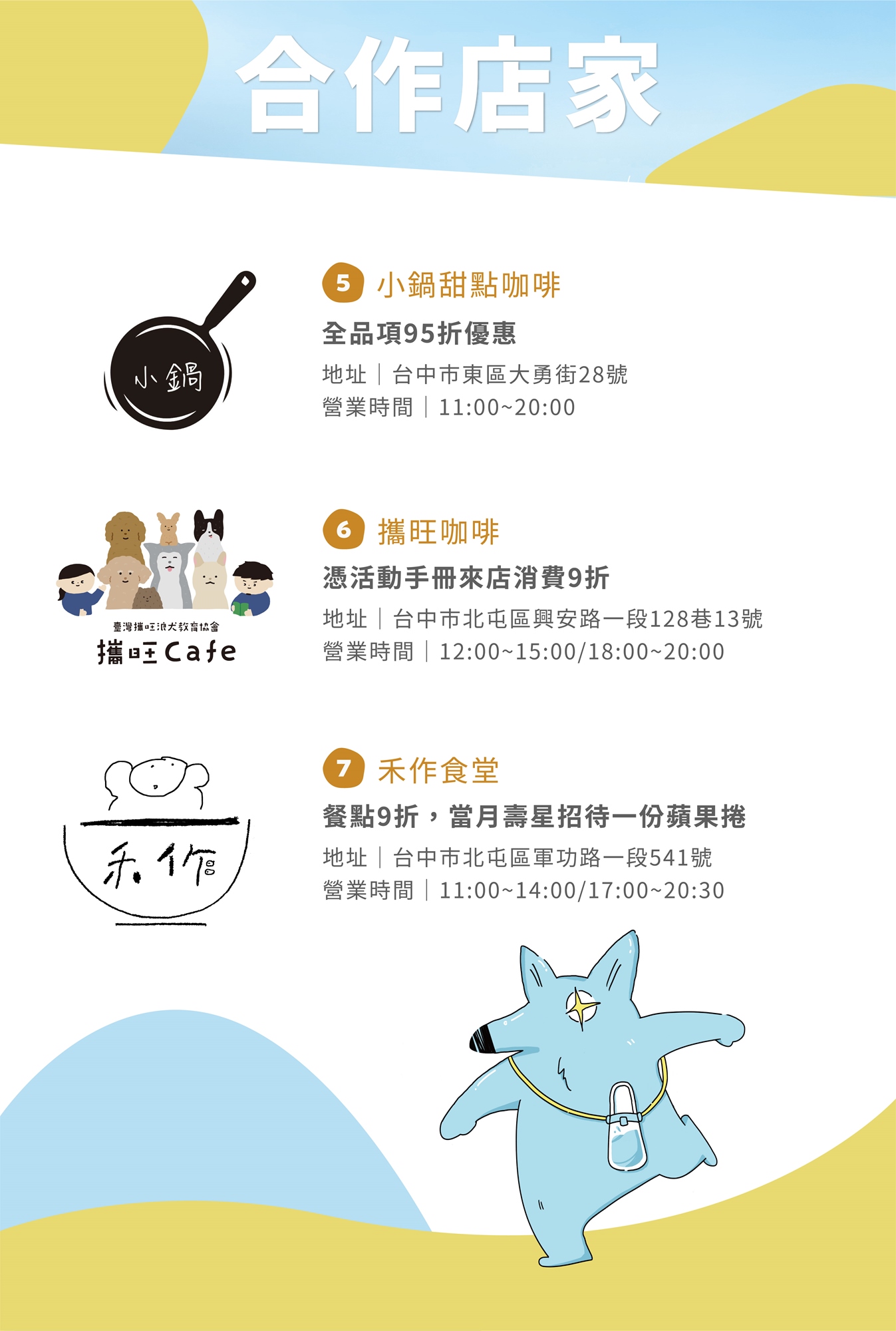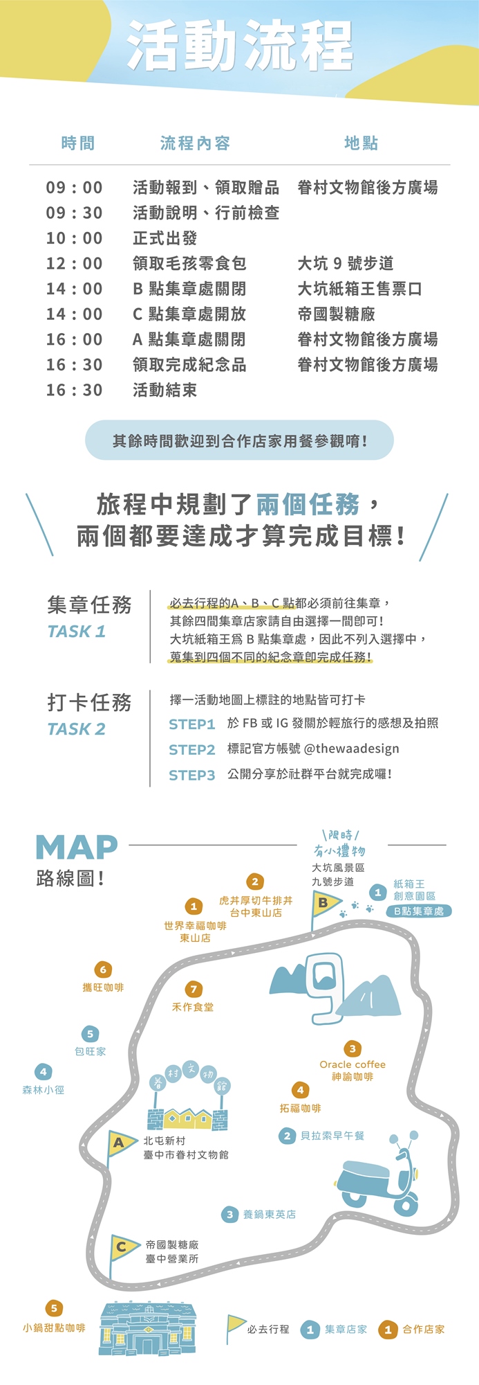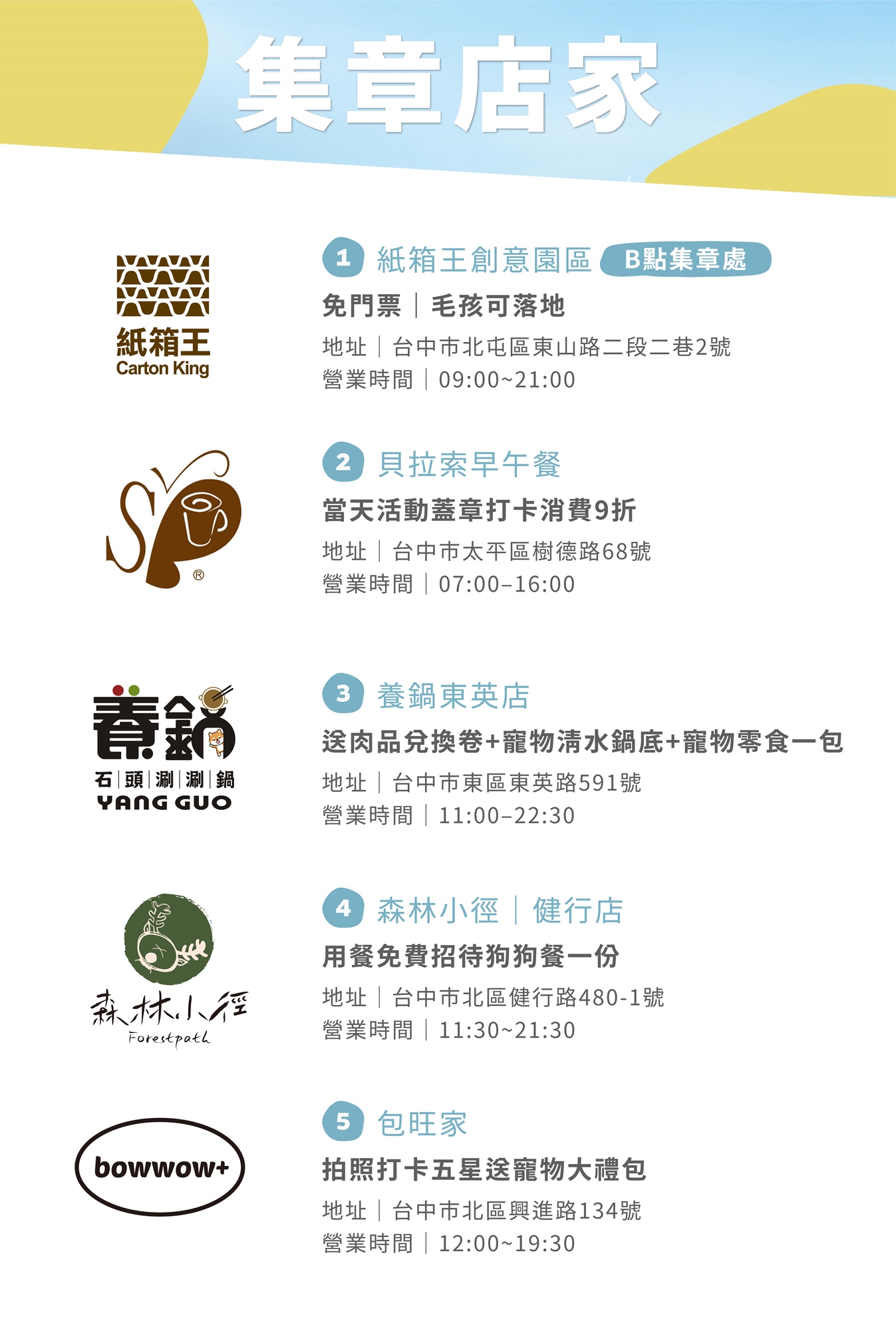 →活動過程中主辦方無提供餐食,請評估活動時間自行攜帶毛孩餐食、防曬用品與藥物等必需用品,部分店家進入需有禮貌帶,出發時可先確認有沒有需要攜帶喔