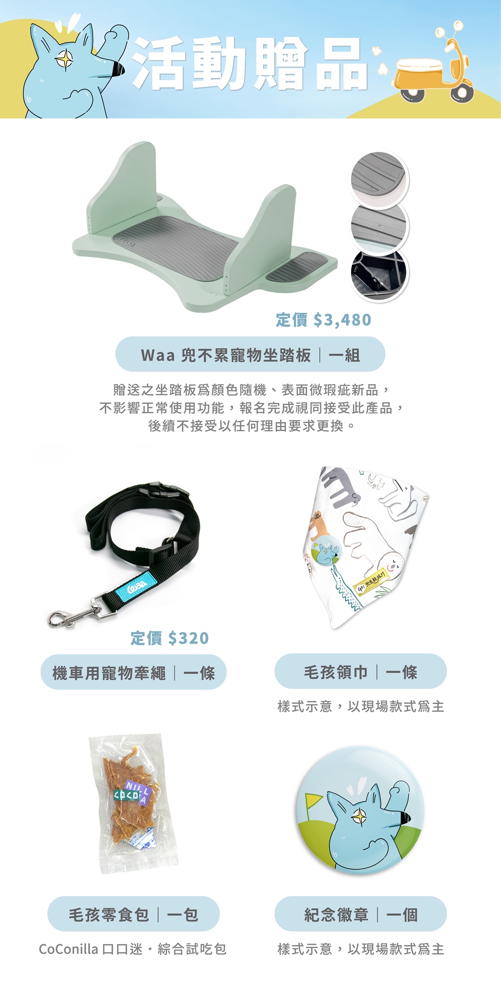 06. 本次活動僅限年滿 18 歲並持有中華民國相應有效機車駕照,且具有機車駕駛能力與實際道路經驗者參與,請自行準備機車並確保車輛狀況良好。騎乘過程請務必遵守交通法規,避免意外發生,保護自己也保護毛孩安全