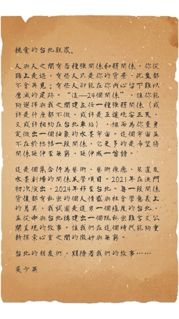 「漾 - 24個關係」是一場水墨影像互動體驗計劃,由澳門藝術家吳少英、音樂人林丹娜和雷諾文共同製作,「漾 - 24個關係」是一場水墨影像互動體驗計劃,由澳門藝術家吳少英、音樂人林丹娜和雷諾文共同製作,分為一對一的互動及劇場演出。演前一個月,由24位觀衆分別與藝術家一對一交流建立關係,然後藝術家根據這不同深淺的交流,在5月演出現場即興創作水墨影像及音樂,創造出代表24段關係的當代水墨作品。每位現場觀眾可在場刊的空白頁面裡寫下或記錄他們在觀看演出的感受。這場私密互動的演出帶來獨特的藝術體驗,彷彿呈現了一面能折射創作者內心世界和觀眾心理狀態的鏡子,讓觀眾與藝術家和音樂家打破舞台界限,達到共享、共創和共思的成果。