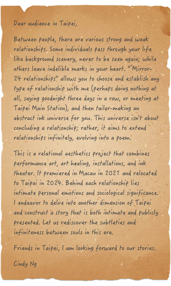 Mirror- 24 relationships is an interactive ink painting images experience project jointly produced by Macau artist Cindy Ng, musicians Yaya Lam and Bobo Loi. The project has two parts, one-on-one interaction and live theater performance. 24 participants would start their one-on-one communication with the artist and set up their individual relationship one month prior to the live performance. Artist then improvises ink painting images as well as music at live performance to reflect her understanding and feelings to each person. 24 unique contemporary works representing the 24 relationships are thus born.