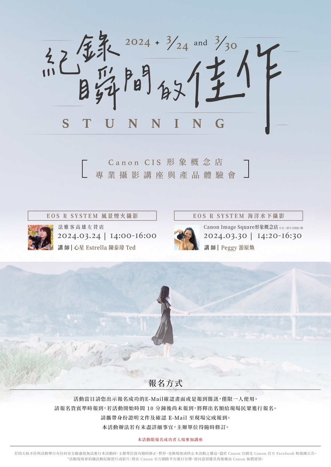 攝影不僅僅是捕捉影像,更是一種藝術,一種表達情感和觀點的方式。你是否曾被攝影的畫面所吸引?是否希望能夠掌握攝影技巧,用鏡頭捕捉生活中的美好和情感?如果是,Canon 將於台北/台中/台南/高雄舉辦【Canon CIS形象概念店 專業攝影講座與產品體驗會】活動,當日邀請業界知名攝錄影師現場分享使用心得與拍攝心法,並提供與鏡頭現場體驗,我們誠摯地邀請您共同參與!