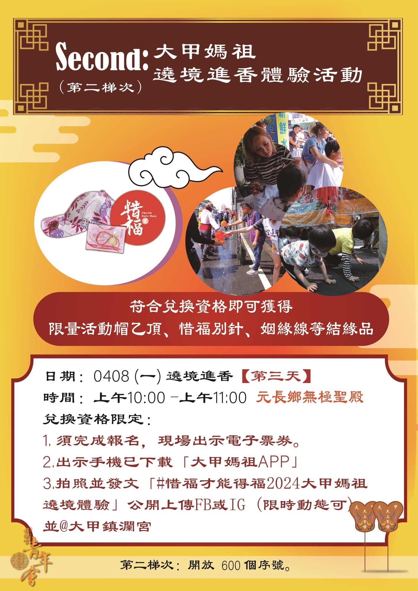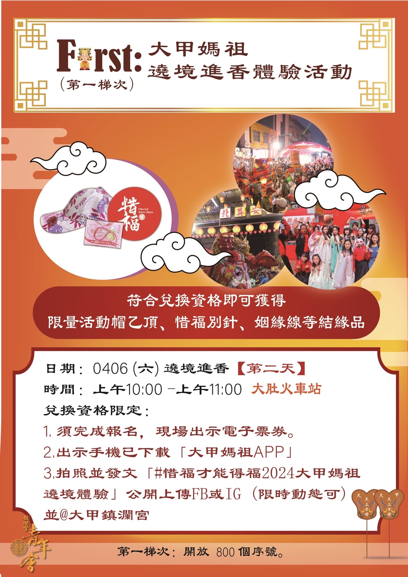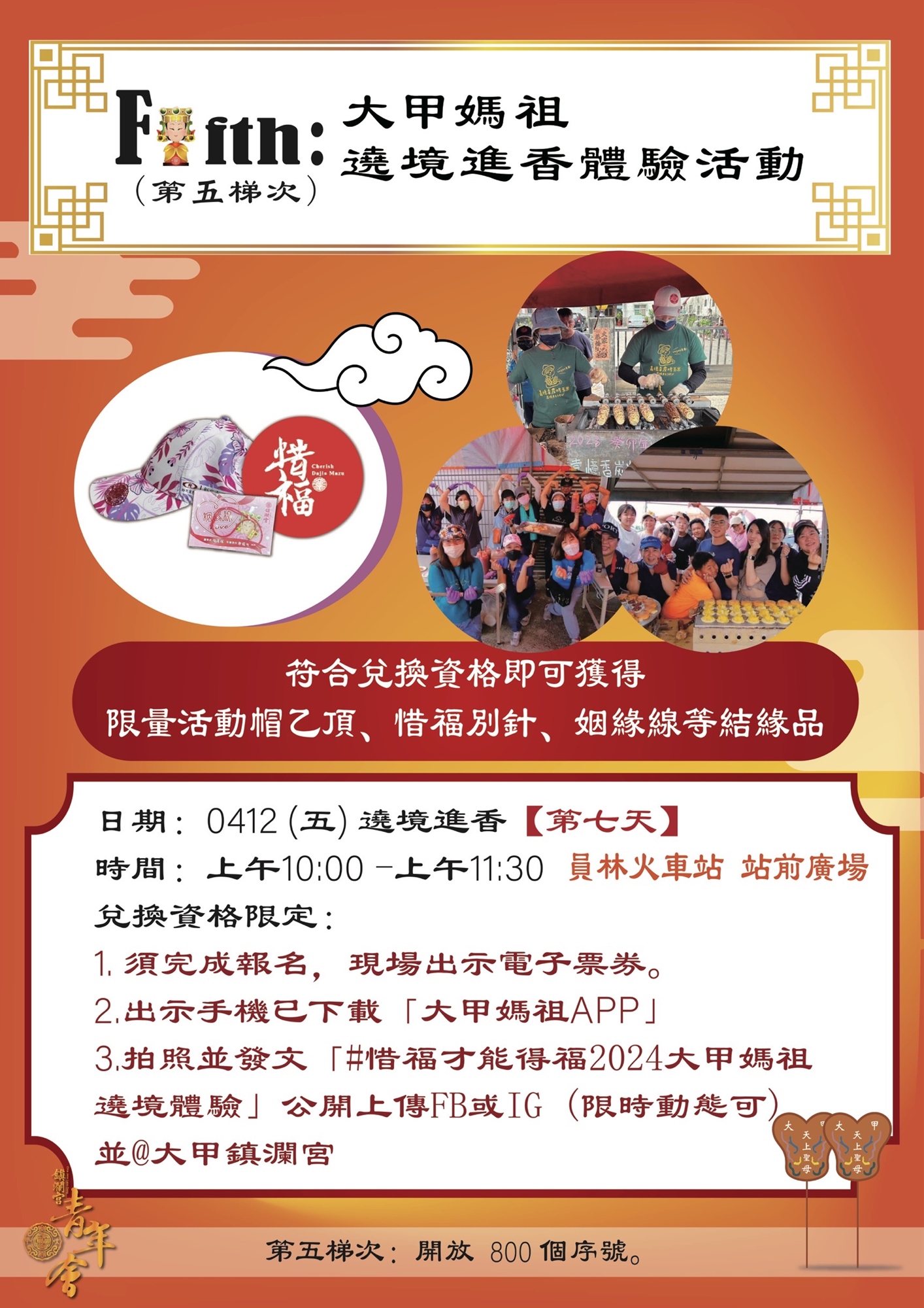 大甲鎮瀾宮天上聖母遶境進香活動,被譽為「世界三大宗教活動」之一,大甲鎮瀾宮舉辦單日體驗,讓一般上班族和莘莘學子在工作與課業之餘,也能參與這為期九天八夜的文化宗教盛會,共同接力造訪一百七十餘間宮廟,繼續綿延三百三十公里的感動。