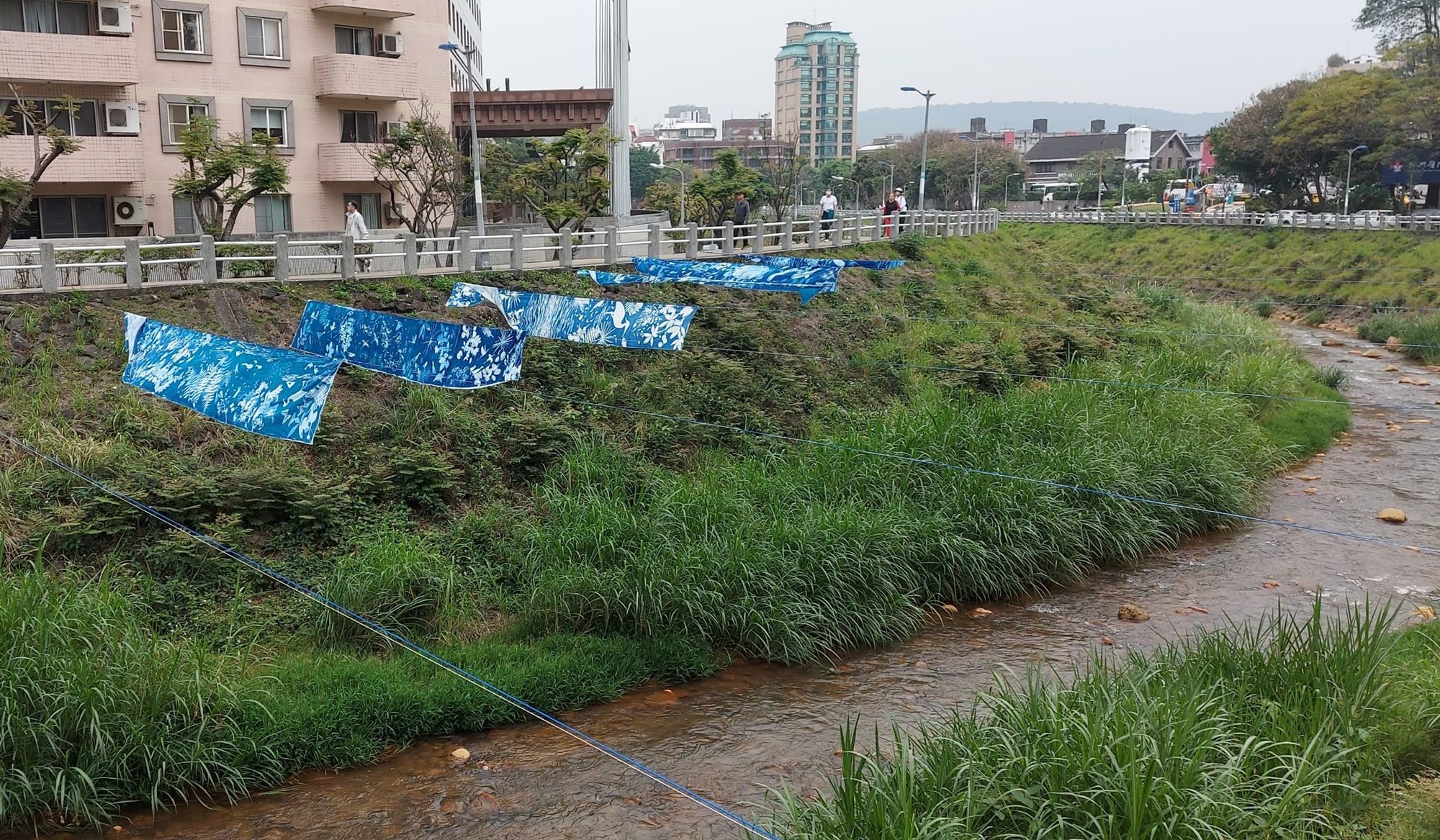 磺溪,自陽明山奔湧而下貫穿天母,城市改變了河流的地景,築高的河堤隔絕了溪,人們散步在自然與城市的縫隙上,遙想老人家兒時在家門前河上跳石頭;作品以藍曬花布打開河堤的視角侷限,重塑磺溪地景,以時間曬印溪流畔動植物的輪廓,流瀉的光染成深藍串起藝術、生活、生態共感,穿過溪流潺潺的節奏,在蜿蜒河道上以藍曬地景擁抱磺溪,透過藝術觀看的視角,重新看見人與溪流的關係。