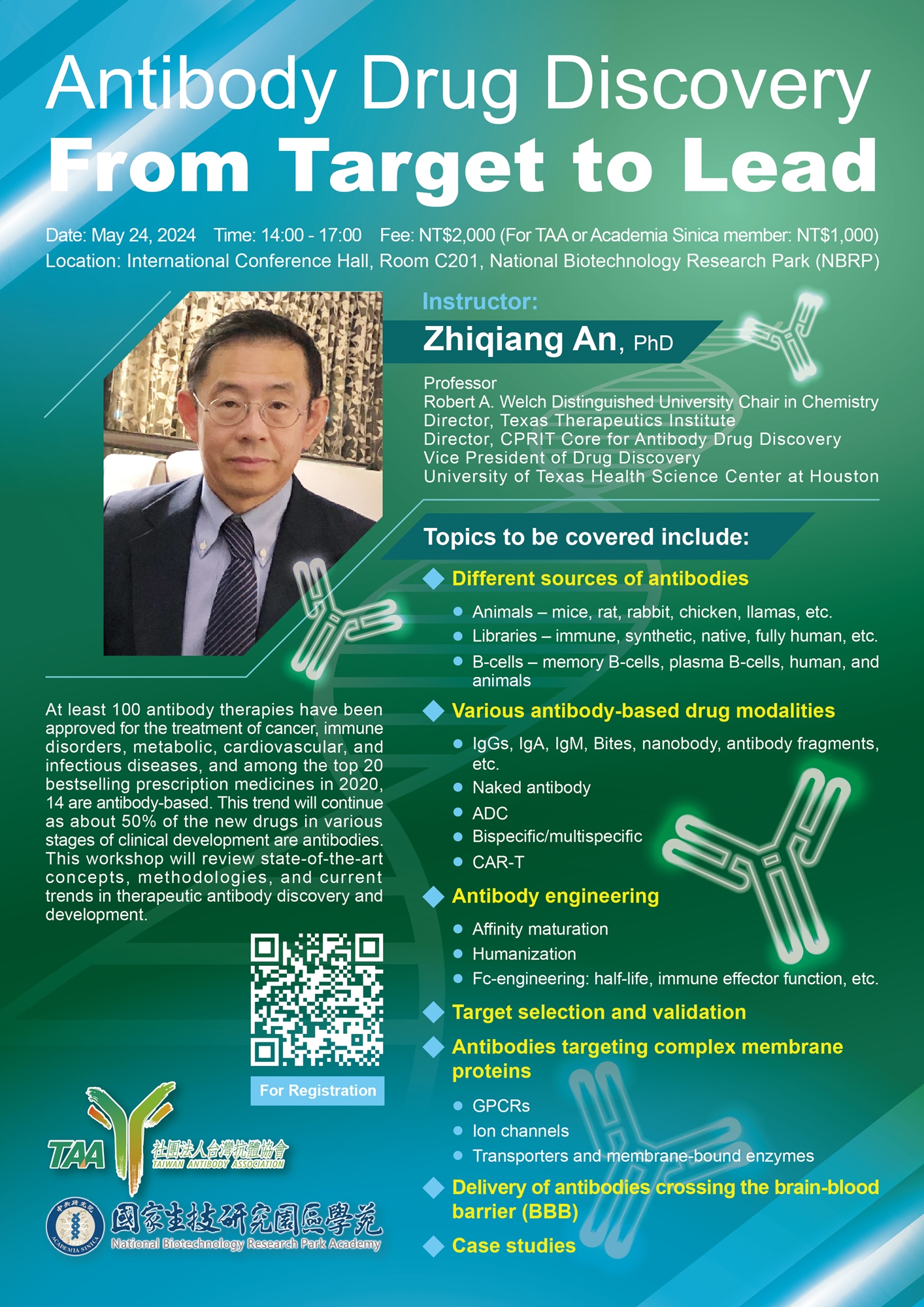 本工作坊有幸邀請到在抗體藥物開發領域享有盛名的安志強博士擔任主講。安博士目前擔任德州大學健康科學中心(休士頓)的Robert A. Welch化學領域傑出大學講座教授、德州藥物研究中心主任、抗體藥物探索CPRIT核心設施主任以及藥物探索副總裁。他曾於Merck Research Laboratories和Epitomics公司擔任要職,積累了豐富的生物藥物研究和開發經驗。