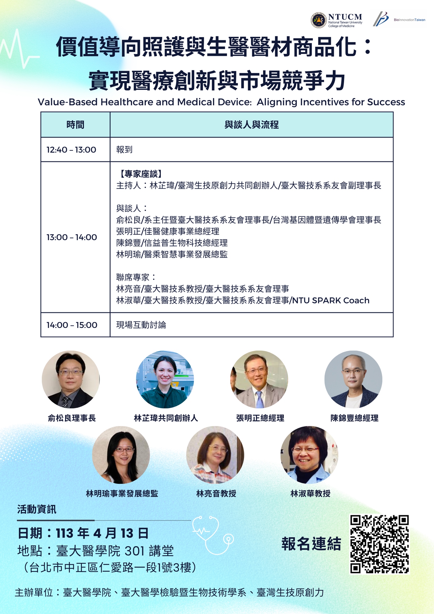 本次座談會邀請到臨床醫學、醫材法規、市場策略、通路行銷等醫材商品化歷程息息相關,具有實務經驗的專家,以及鏈結產業與學術具有豐富經驗的臺大醫技系專家教授與會討論。在座談會上,將與現場與會人共同對談,探討價值導向與醫材創新如何協作發展。