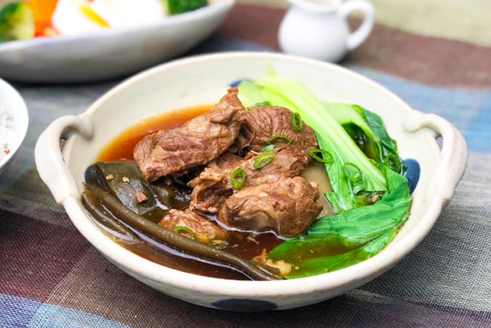 說是辣椒,其實辣才不是重點,油炸剝皮,再用醬油、糖、鹽等醃漬而成的剝皮辣椒,脆、甘、溫和微微辣,只要稍微燉煮一下,味道精華會漸漸釋放出來,加上常備菜腱子心和牛肋條,入口麻麻的、不辛辣,Q彈的筋、多汁的肉,甘甜溫順滑過喉嚨、會上癮!