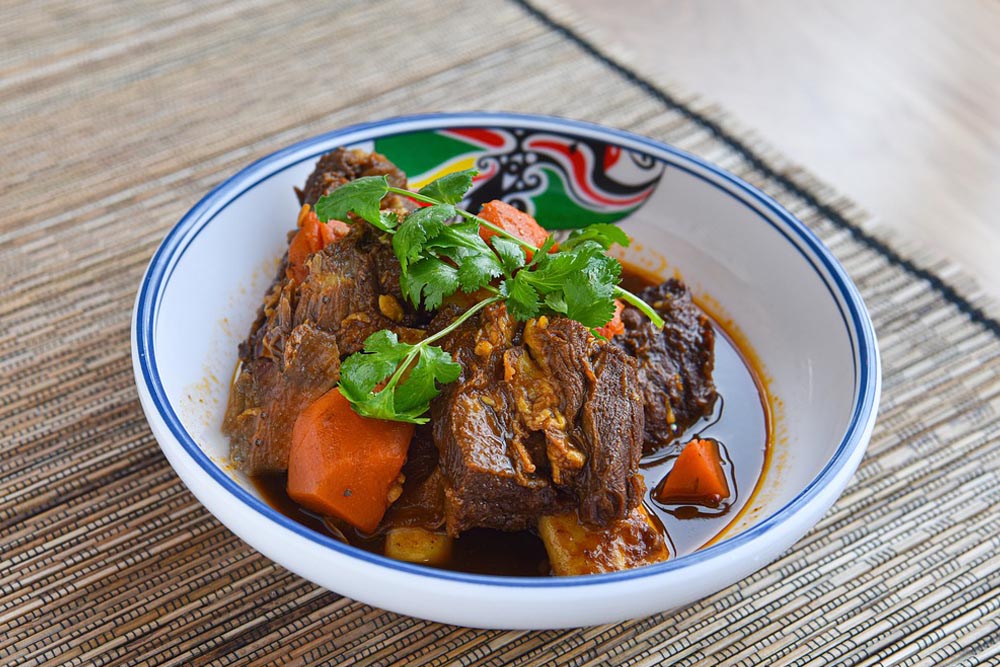 紅酒燉牛肉取紅酒、洋蔥、大蒜、香料為主原料,通常還會和蘑菇、紅蘿蔔等一起燉煮。由於紅酒富含單寧,會與牛肉的蛋白質結合,降低肉肉的油膩感。