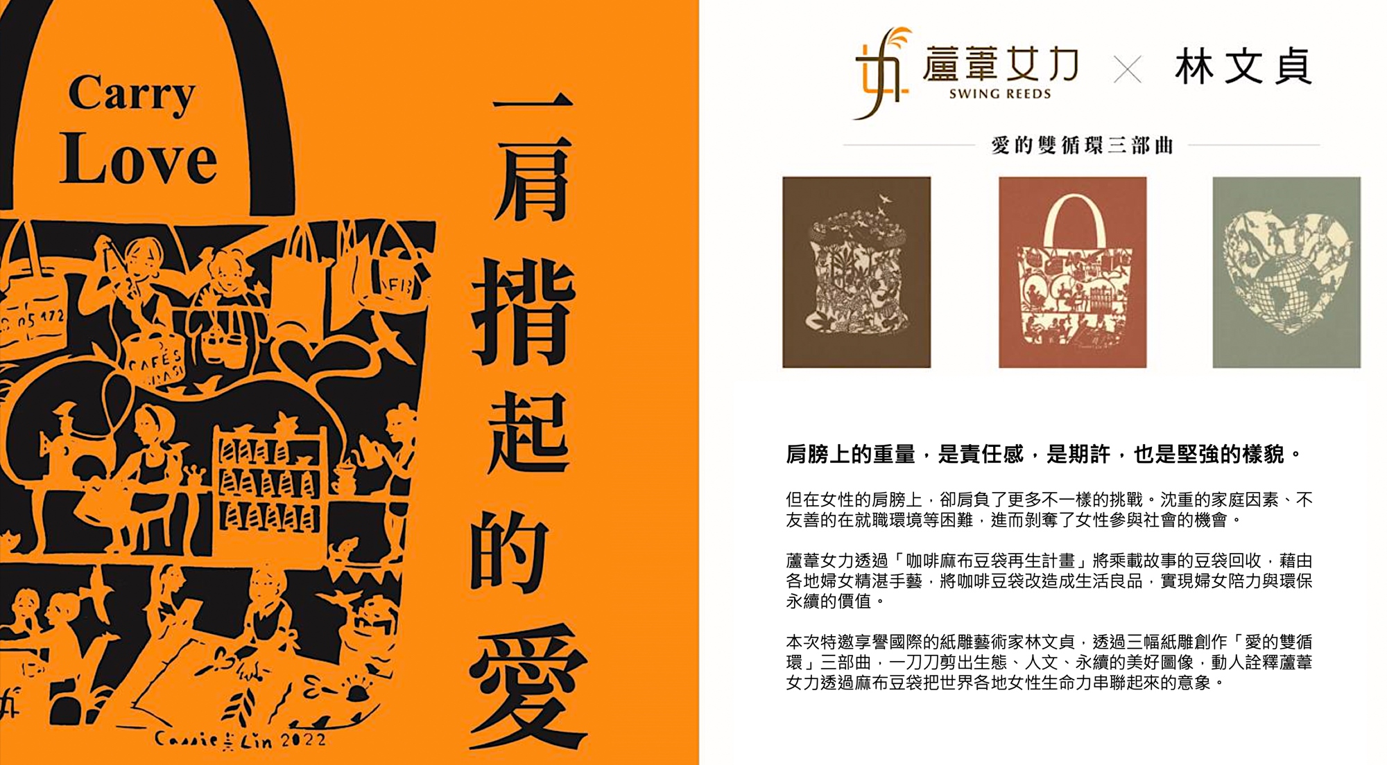 本次增加一個特別的藝文展覽,主題為『Carry Love 一肩揹起的愛』,是由享譽國際的紙雕藝術家林文貞,將蘆葦女力長年來透過咖啡豆袋再生計畫推動「循環經濟×婦女培力」的精神,藉由三幅紙雕創作「愛的雙循環」三部曲,一刀刀剪出生態、人文、永續的美好圖像,動人詮釋蘆葦女力透過麻布豆袋把世界各地女性生命力串聯起來的意象。