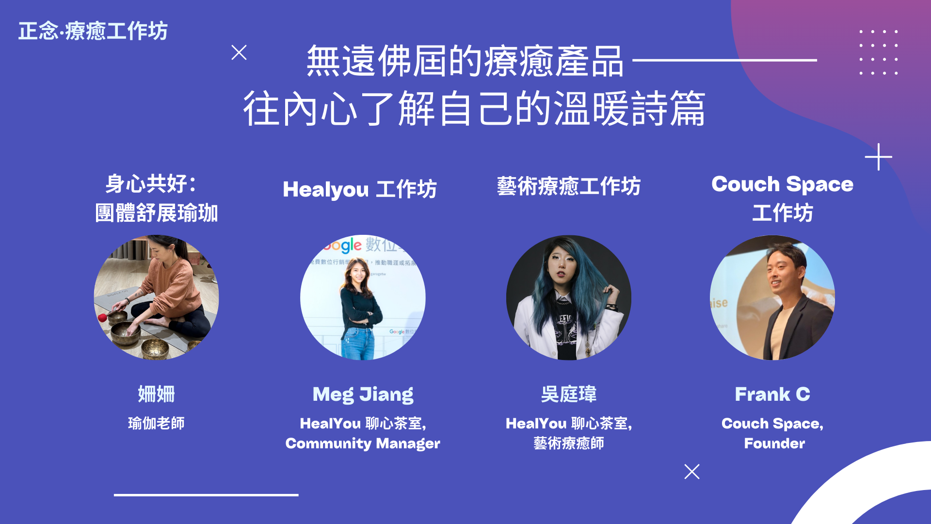 最後,我們將帶來一場充滿溫暖和共鳴的療癒活動。這將是一個意味深長的時刻,讓參與者靜心聆聽自己內在的聲音,感受到溫暖和安寧。