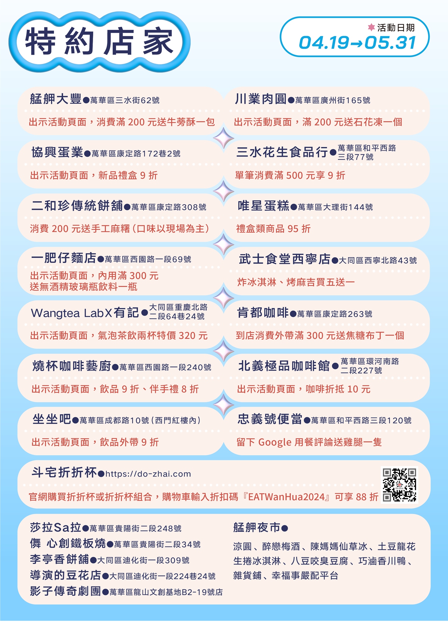 在大大的萬華挖呀挖呀挖~寶藏美食五告賀甲!自113年4月19日至5月31日止,活動特約店家專屬優惠隆重登場,這麼好康快去吃一波!
