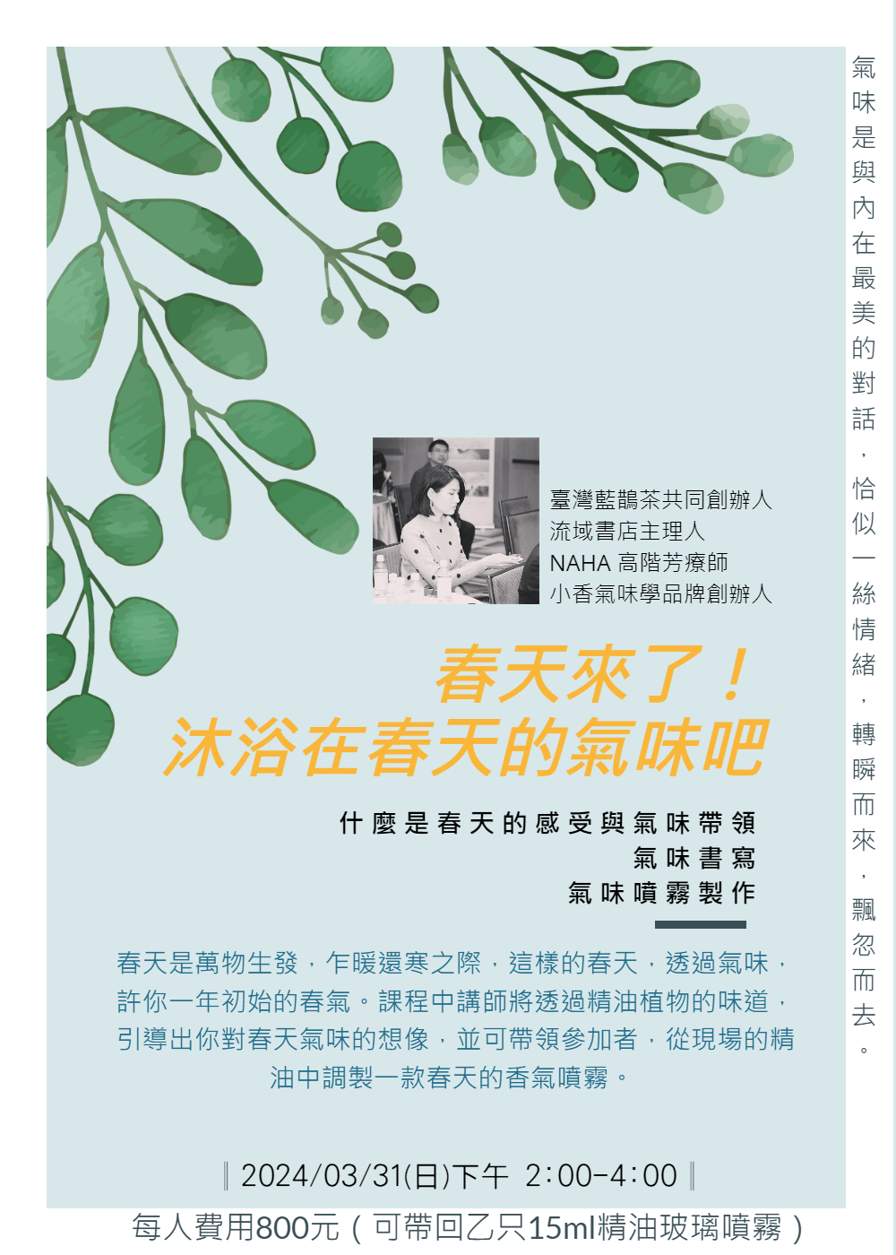 春天是萬物生發,乍暖還寒之際,這樣的春天,透過氣味,許你一年初始的春氣。課程中講師將透過精油植物的味道,引導出你對春天氣味的想像,並可帶領參加者,從現場的精油中調製一款春天的香氣噴霧。