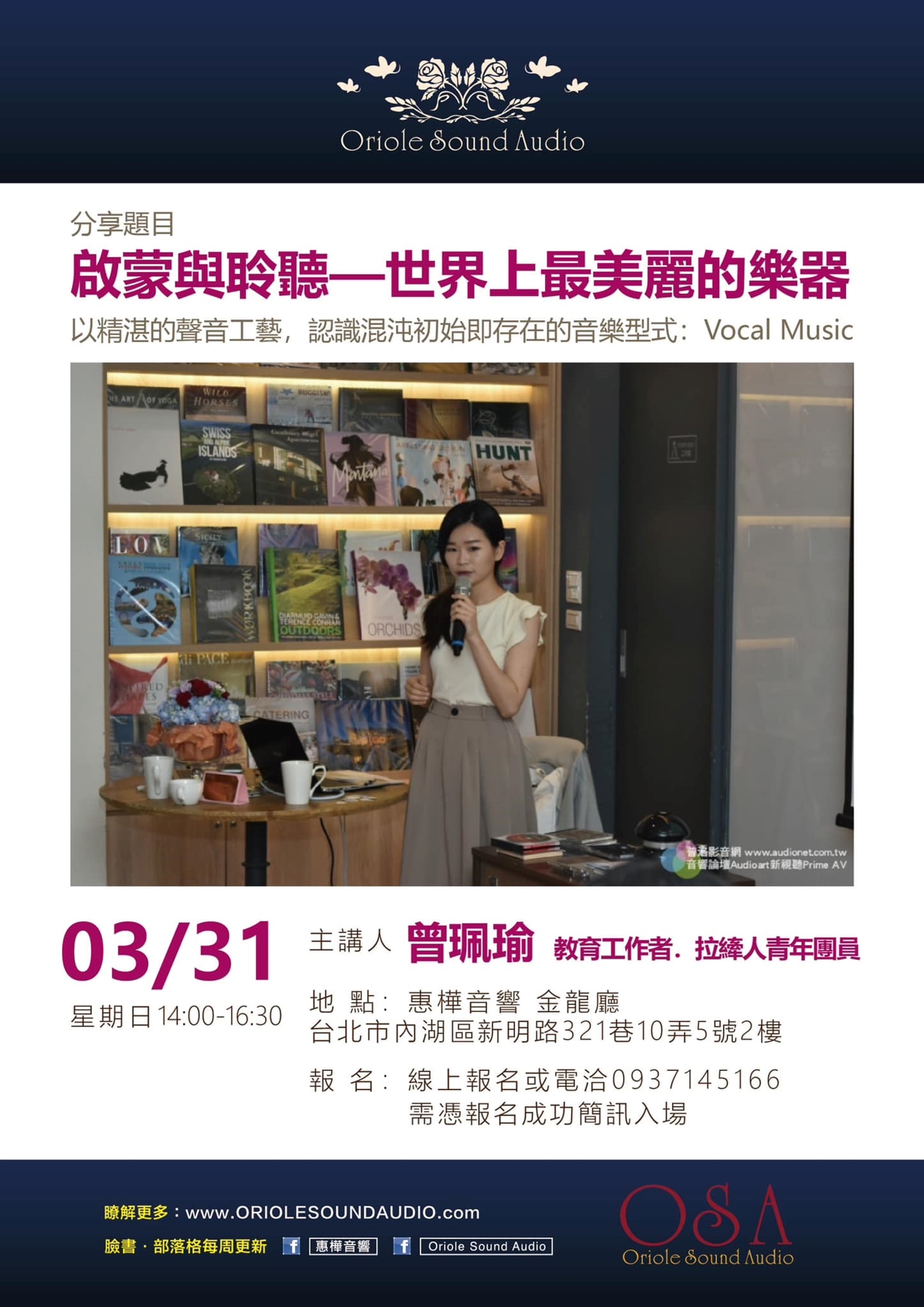 鳥語花香的季節,3月31日周日下午2點至4點半,惠樺音響現場安排使用Oriole Sound Audio(OSA)的真空管機系統,以精湛的聲音工藝,聆聽從盤古開天闢地以來,即存在的音樂形式:人聲音樂(Vocal Music)。