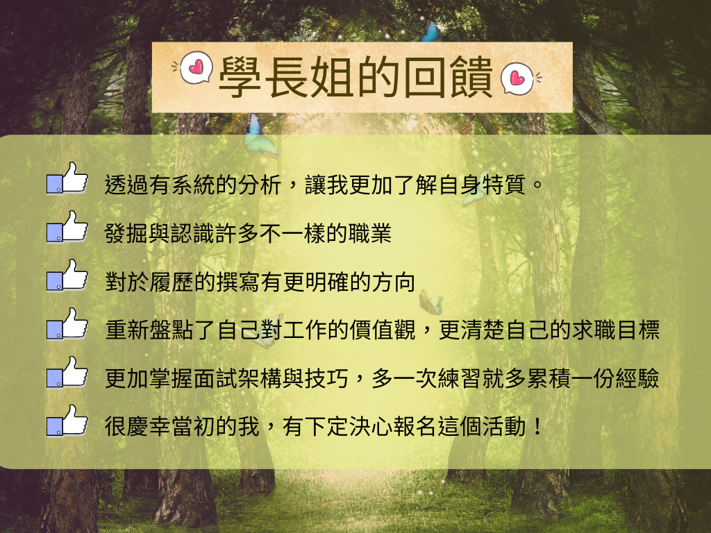 在未來職涯的準備上,難免會有所迷惘😥,你所需要的是一個能讓你釐清方向,建立強大的自信心💪。