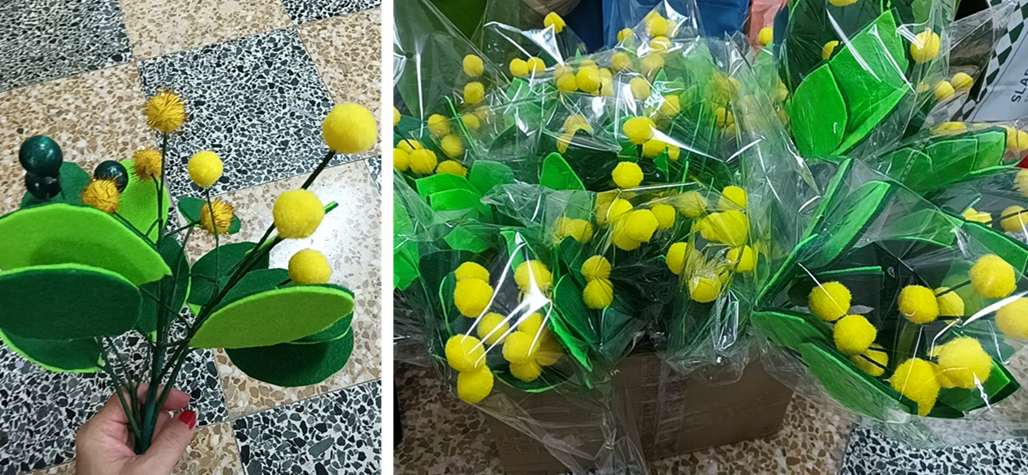 屏東六堆客家庄常見的含笑花、樹蘭、夜合、桂花以及新丁花等被稱為「客家五花」,客家詩人曾貴海,就以客家五花作為新詩題材創作,我們透過繪本讓小朋友瞭解五花,並在老師的DIY指導下,製作出自己的客家舞花花束。