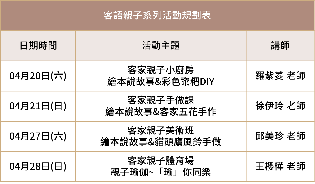4月份免費的親子體驗小教室開張啦!!此次我們邀請很多手做老師,帶來非常趣味的親子體驗,讓家長能和小朋友一起共同學習玩樂,希望大家能踴躍報名給我們鼓勵,我們會再開出更多有趣的課程,讓大家一起玩樂共學!