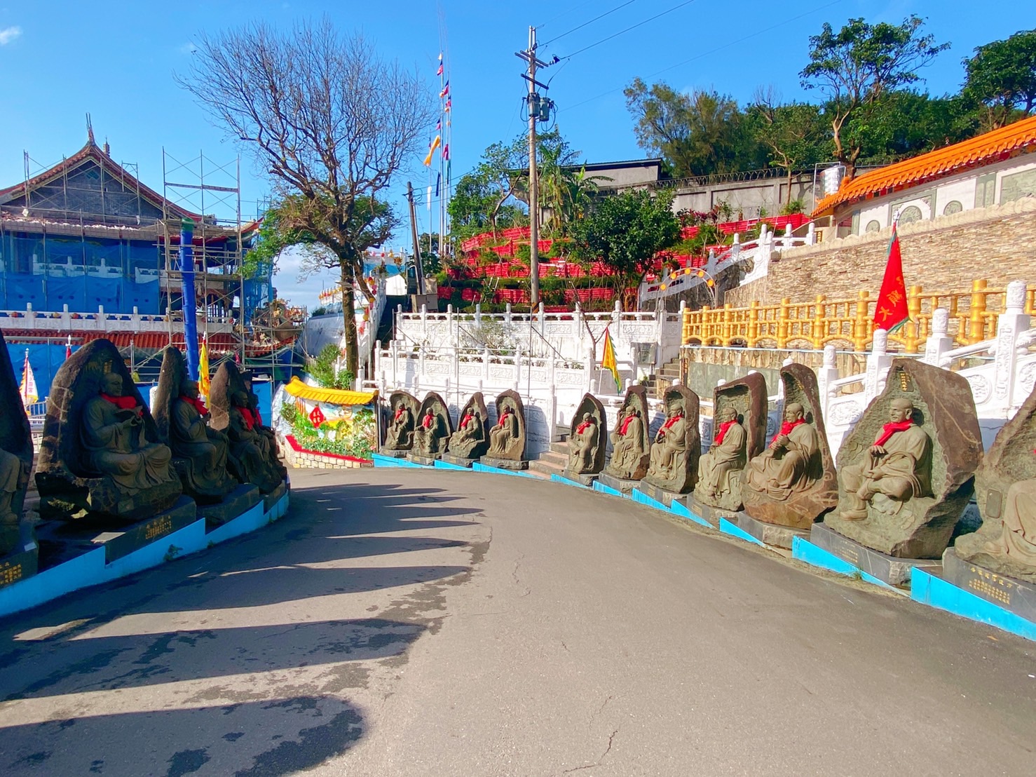 📢轉進和平街後不久就會看到天顯宮,緩緩而上的道路雖非曲折,但在接近牌樓的時候則是豁然開朗,頗有暗示人生旅程先苦後甘的隱喻,羅列兩旁的五百羅漢一字排開,其栩栩如生的神情,不僅姿態各異而且氣勢非凡,所有的神像都是以整塊青斗石雕刻而成,與真人齊高,除了表示歡迎之外還兼具洗塵作用,將所有來訪的信眾一一拂去煩惱塵囂,藉以引人入聖,這樣特別的風格,放眼全台亦屬罕見。