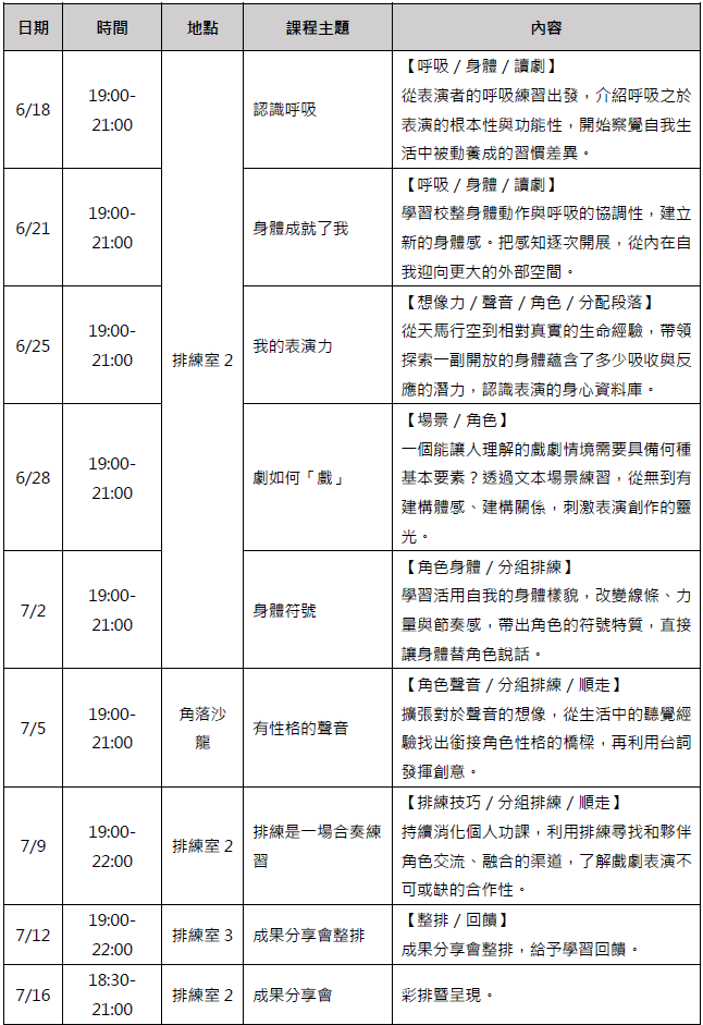 對象:18歲(含)以上,喜愛表演藝術課程之民眾。