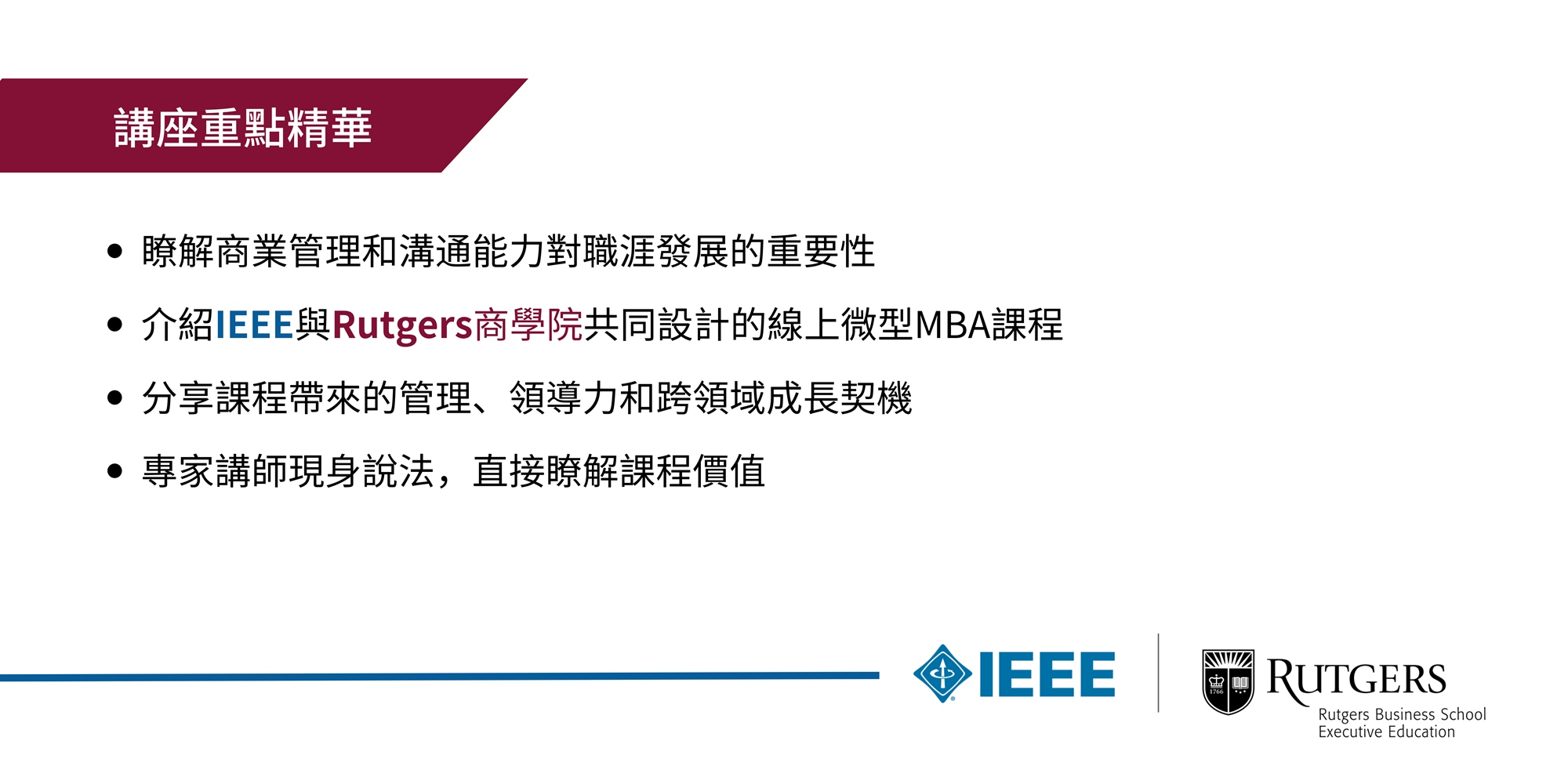 IEEE與Rutgers商學院專家講者將在本次線上說明會,分享協助工程師提升職涯發展所需的訓練資源,並介紹IEEE | Rutgers線上微型MBA課程。