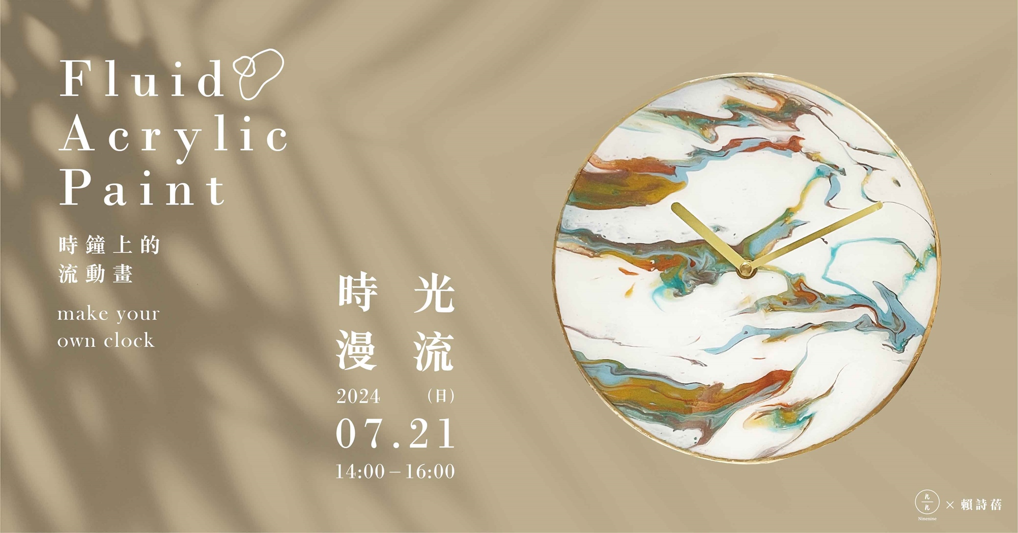 滴答的時鐘不間斷地走著,靜靜地細數著生活的每一刻,但它平凡的外表,其實可以穿上一襲彩衣,而這件衣服應該「自己做」。用流動畫繽紛的色彩妝點,用顏色與創意在鐘面上恣意漫遊,創作出獨一無二的療癒之作,讓你的房間不再只是房間,而是美麗的私人風景。