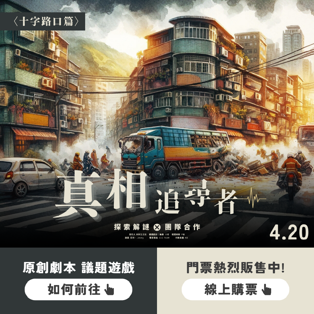 《真相追尋者》:十字路口篇製作團隊//發行人:療寮生活館 Chitchat LIFE @chitchat.clinic遊戲設計:小樹 @carbymonster編劇:小樹 @carbymonster美術呈現: P編 @chitchat.clinic遊戲道具:小樹 @carbymonster 、kb @1chiki_onetree聲音演出:hui @huisunya、欣欣 @nico._.520、瑾秀 @sherbe0911演員:雯祺 @wan.su.1992、Jimmy @jimmyleft行政支援:kb @1chiki_onetree、小妹 @fufu000279