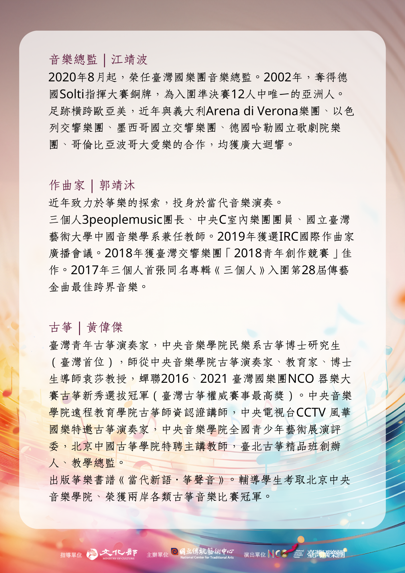 音樂總監江靖波老師將分享如何編配耳熟能詳的管弦樂曲《波麗路》為國樂版,以不同音樂色彩的聲音表現,帶來更為豐富的音樂魅力與驚喜聽感。最後將隆重介紹本場壓軸《風雅頌之交響》,樂音如何傳達「詩經」的文學意象,帶來標題音樂的畫面感,文學與音樂的對話就此展開。