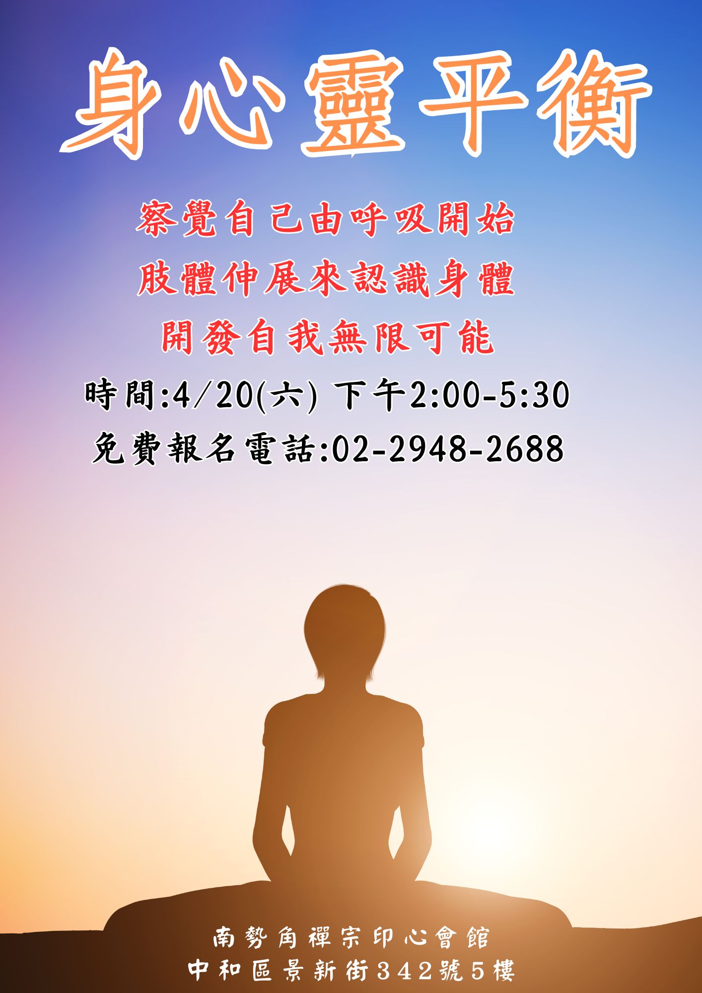 地點:新北市中和區景新街342號5樓(南勢角禪宗印心會館)