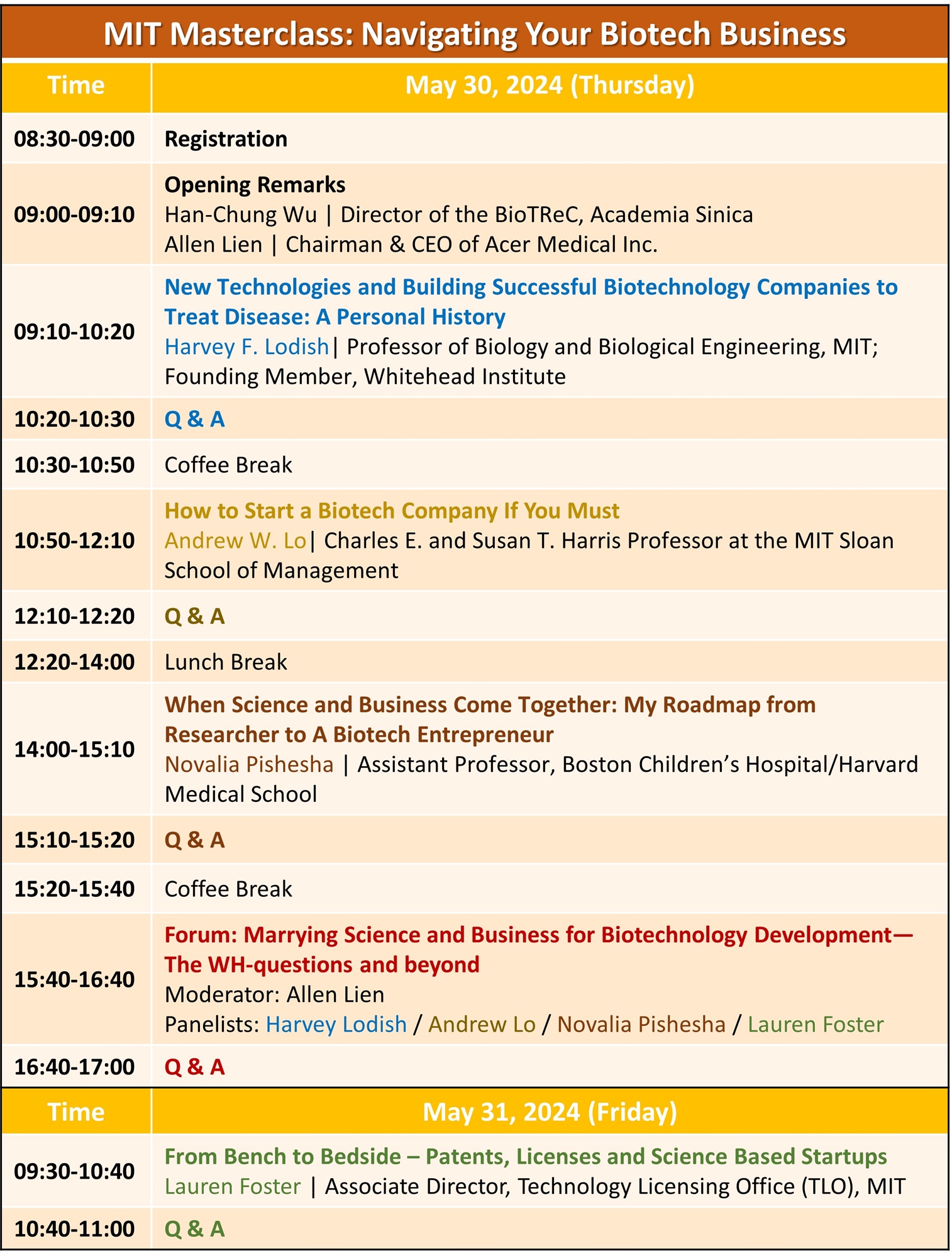 - Andrew Lo,TIME雜誌票選世界百大影響力人物,首位教授”Healthcare Finance”的專家。將以財務角度分享成立生技新創的秘訣,包含藥物開發的臨床試驗,以及投資生技新創的不同商業模式。
