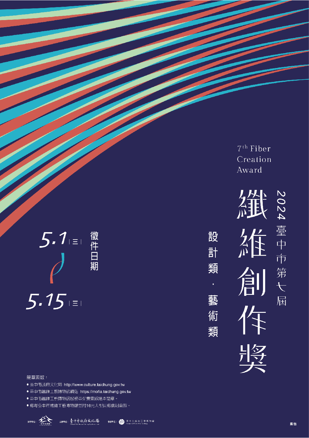 備齊報名表暨作品照(圖)片書面資料,於本年5月1日-5月15日親送或郵寄,郵寄請寄至「臺中市纖維工藝博物館(412015臺中市大里區勝利二路1號,電話:04-24860069)」, 並註明「報名臺中市第七屆纖維創作獎」,郵寄以郵戳為憑;親送者請於報名期間內每日9時-16時送件至「臺中市纖維工藝博物館服務台」。